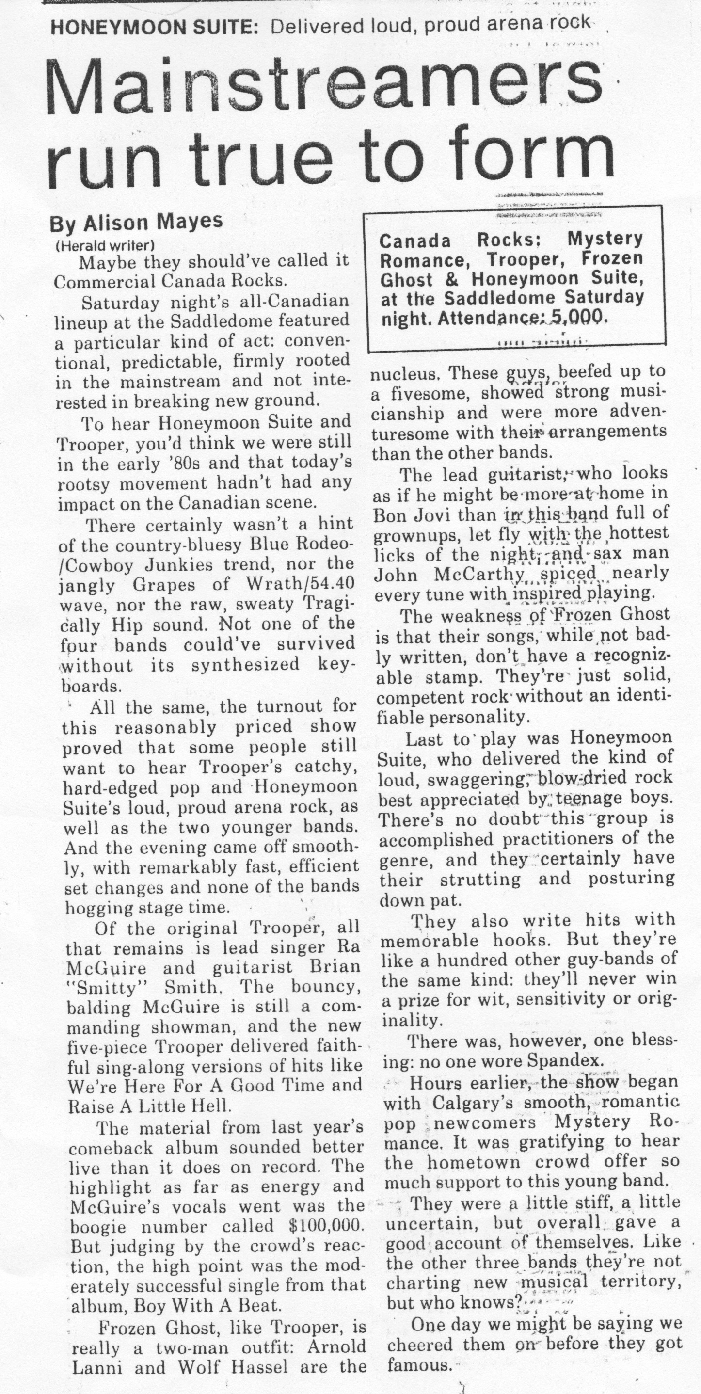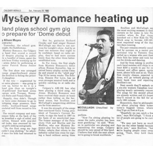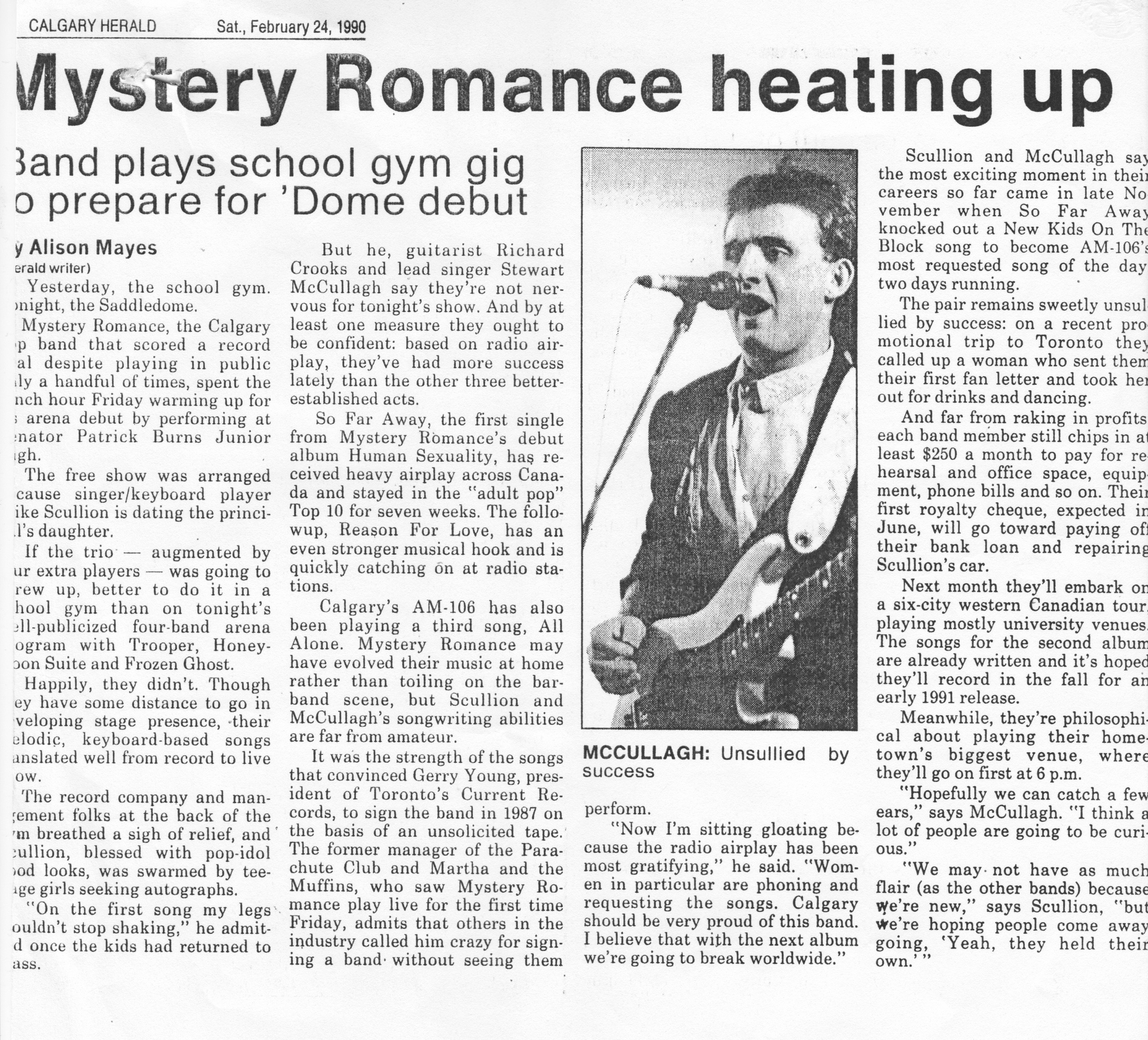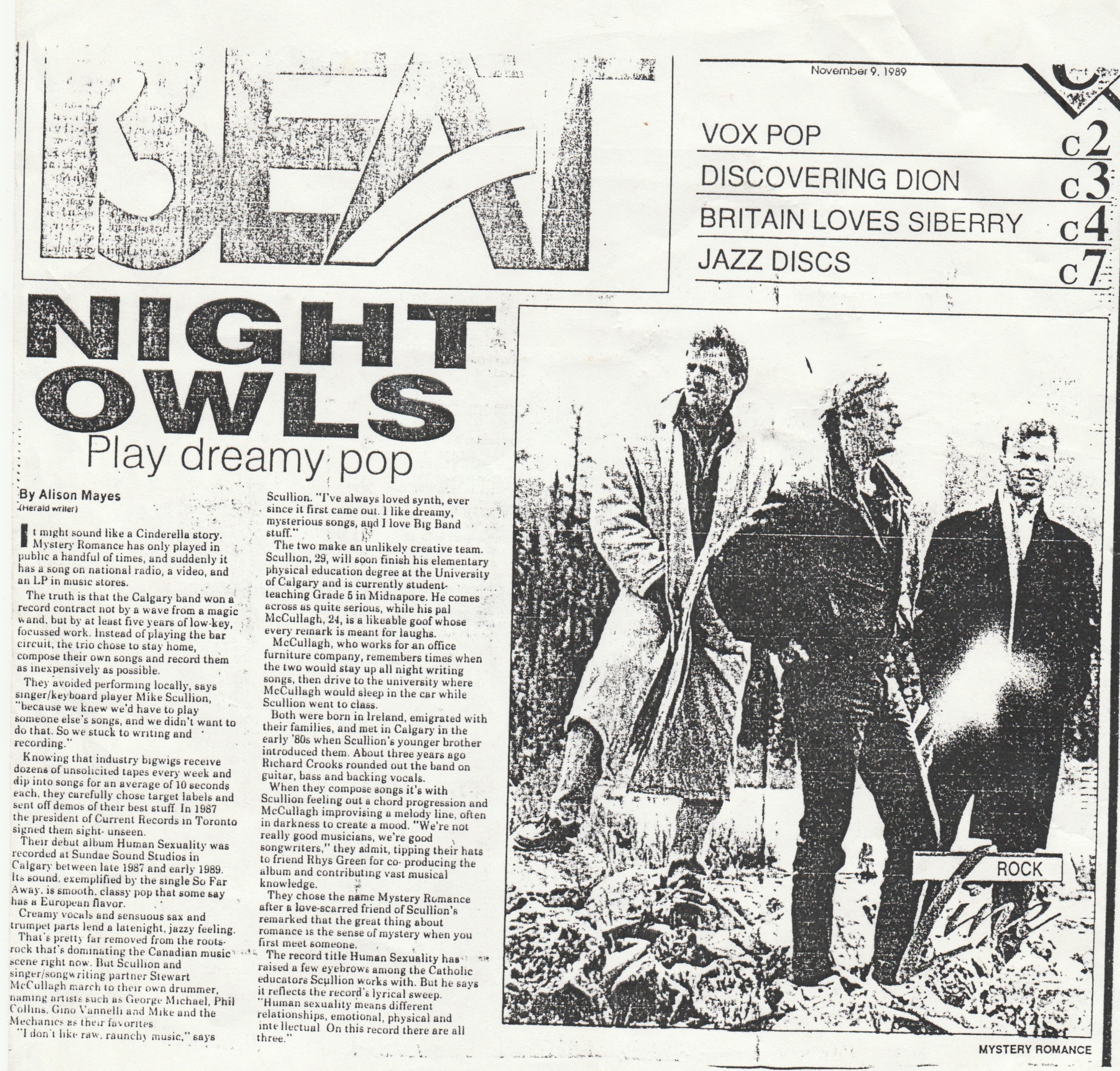 From Calgary, Alberta. Signed to Current Records in the late 1980s. They briefly became Trinity Square with new singer Leroi Keiller in the 1990s. With the addition of Green and Lapsley in the 2000's, the band returned to calling themselves Mystery Romance; Scullion became an award winning documentary film maker for Diamond Rock Films; in 2023 the band released a new album, 'Flying Through the Moon', with the leadoff single "Story of We".