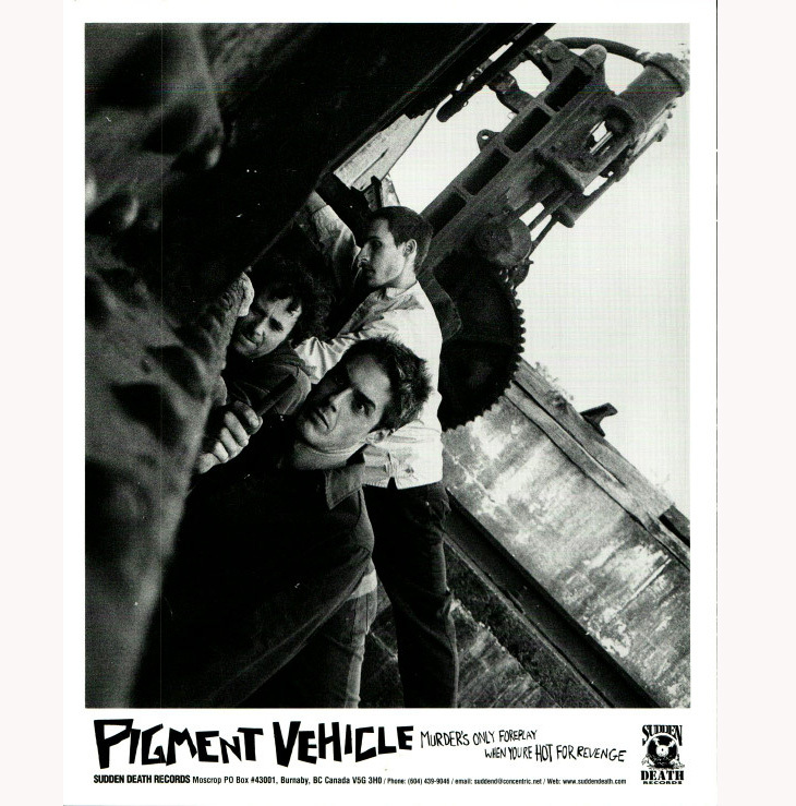Pigment Vehicle were a very early math rock band from Victoria, B.C. Information on this band, and recordings of their music, are scarce; see Fecking Bahamas’ coverage (archived) and the Live Victoria thread linked therein (archived). They are associated with fellow Victorians Nomeansno, playing in a similarly noisy, sometimes goofy, and sometimes mathy style of post-hardcore/post-punk/punk. If Nomeansno’s works like “Sex Mad” (1986), “Small Parts Isolated and Destroyed” (1988), and “Wrong” (1989) were proto-math rock, then the works of their apprentice, Pigment Vehicle, were arguably early artifacts of math rock proper.