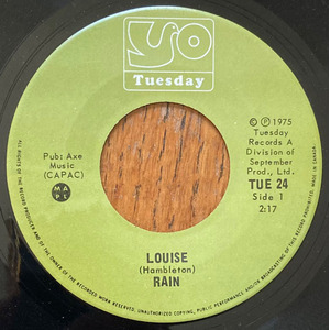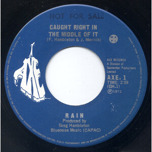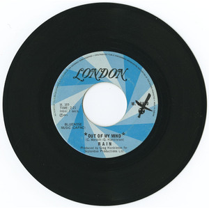 Members of RAIN are drummer Chris Woroch, guitarist Bill McLaughlin, lead vocalist Phyllis Brown, bassist Ron Hiller and keyboards Charlie Hall. Producer Greg Hambleton brought his song "Out Of My Mind" to Rain and recorded and engineered the session at Sound Canada Studios in early 1971. After its release by London Records in April, it took seven months before finally charting in November and now established as one of the biggest hits of that year. This was followed by "Stop Me From Believing" (AXE 1) - both singles released by Bell Records in the United States.