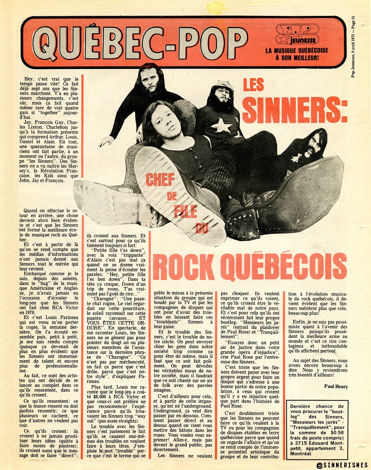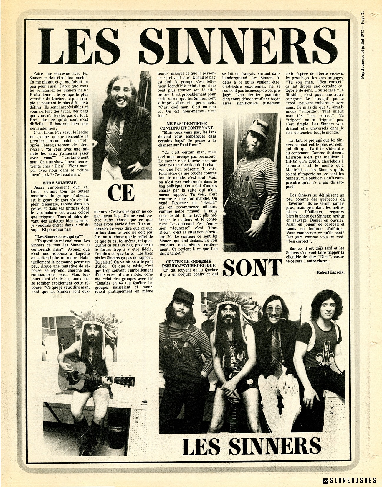 Between 1968 and 1970, Les Sinners adopted the name La Révolution française, after seing L'Osstidcho and talking to Robert Charlebois : because Rock & Roll could be done ''en Français!" and released the albums C.Cool (1968) and Québécois (1969). They take the name of the Sinners and publish in 1971 the homonymous album, Sinners on the Trans World label. The group ended its activities in 1976.