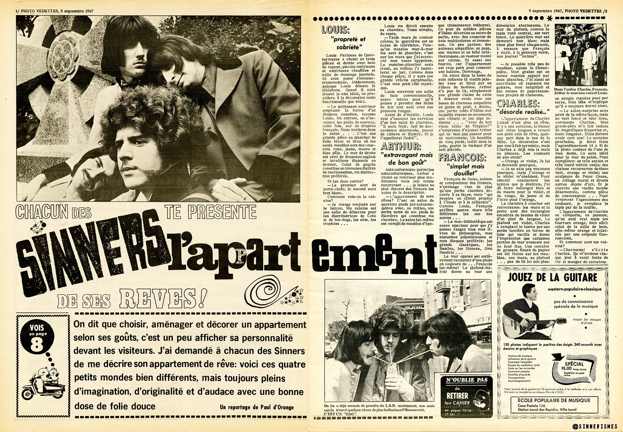 Intellectuels, dévergondés, enfants terribles du yé-yé... Au coeur de l'image relativement sage des années 60, les Sinners portent bien leur nom. Une des premières sorties publiques du groupe, pour marquer la sortie d'un 45 tours, n'est-elle pas une manifestation avec pancartes, sur les marches de l'Oratoire? Arborant un anodin We love the Sinners, les faux piqueteurs s'éparpillent soudain dans différentes directions et la moitié restante du slogan devient We love Sin... Le ton est donné: ces pécheurs ne sont pas du tout repentants et auront tendance à renchérir sur les frasques de leurs idoles: les Beatles pour l'inspiration musicale et les Rolling Stones pour l'attitude.