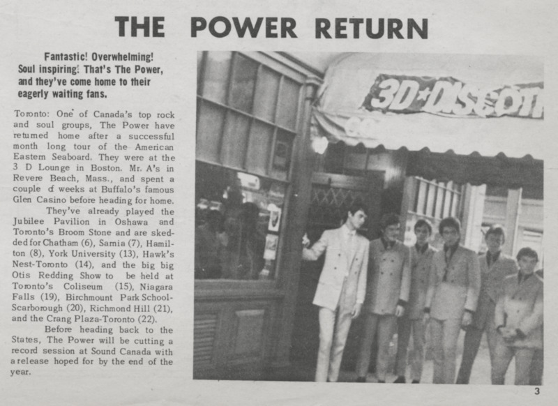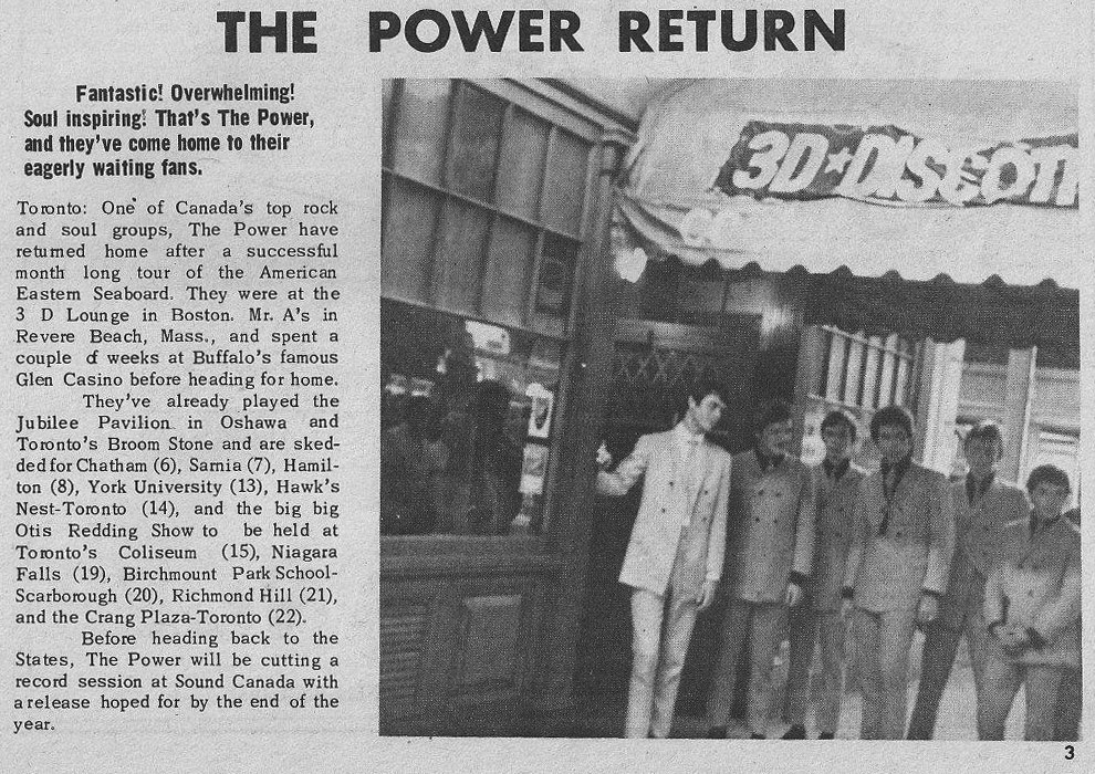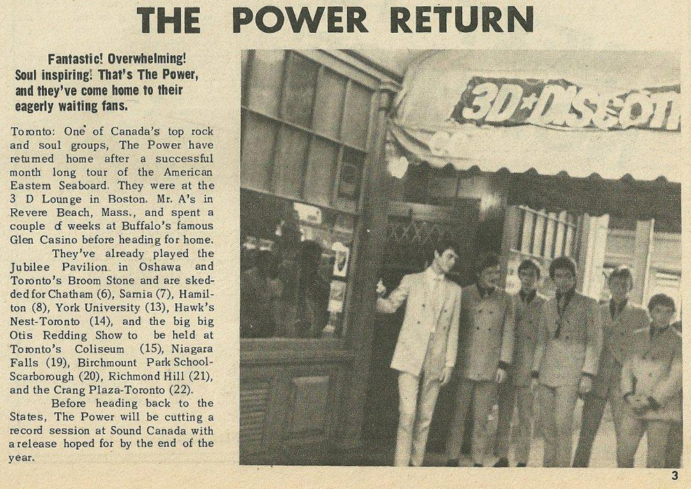 During its first year, the band established a solid fan base on southern Ontario’s dance circuit, billed either as E. G. Smith & The Power or as Grant Smith & The Power. Shortly after a June 27, 1967 show at the Broom and Stone in Scarborough, a Toronto suburb, Charlie Miller left the band. With the lineup reduced to a single drummer, Wayne Stone cut his teeth in the solo drummer chair at a week-long summer resort gig in Grand Bend, Ontario, after which the band headed to the United States, spending 1967’s famous “Summer of Love” working clubs in the Boston area and in upstate New York. On the band’s return to Toronto in early September, Jim Pauley left the band and was replaced by guitarist Jon Palma.