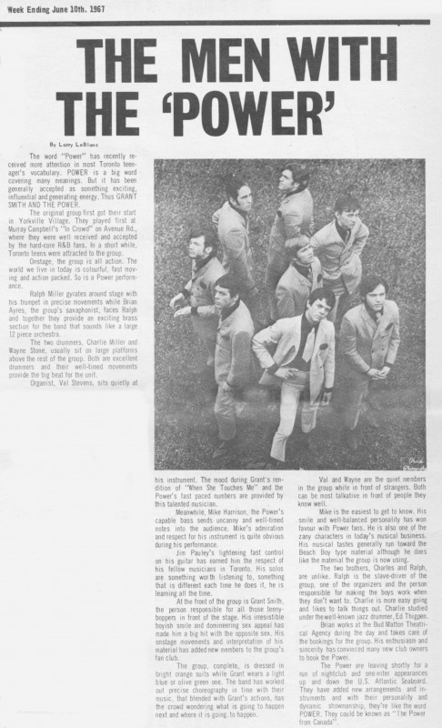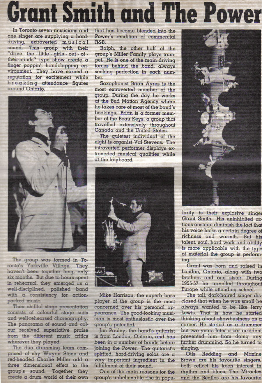 Forming early in October 1966, vocalist Eddie Spencer, organist Val Stevens, guitarist Les Morris, bassist Mike Harrison, drummer Charlie Miller, his brother Ralph Miller on trumpet, and Jerry Mann (Shymanski) on tenor saxophone performed in popular Toronto R&B venues as Eddie Spencer & The Power. On 31 December 1966, the band announced that a new frontman, vocalist Ellis Grant Smith, would replace Eddie Spencer, and that guitarist Jim Pauley would take over from Les Morris. Smith and Pauley were both from popular London (Ontario) band E. G. Smith & The Express. Shortly after, the band’s advisor, Brian “Otis” Ayers, who had earlier played with Ralph Miller in Las Vegas showband The Beau Keys, replaced Jerry Mann on sax. Within a few weeks, Wayne “Stoney” Stone, another former member of The Express, joined the band, creating a unique two-drummer lineup.