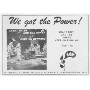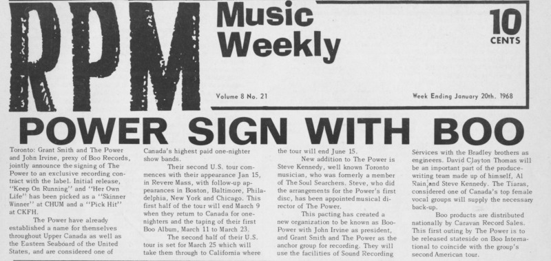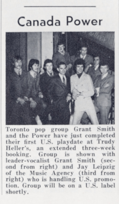 While in New York, guitarist Kenny Marco replaced Palma. Marco had played with The Upset, but especially with Ayres and Ralph Miller in The Beau Keys during the mid-‘60s. On March 17, 1968, between U.S. dates, Grant Smith & The Power opened for The Hollies and Spanky & Our Gang at Toronto’s O’Keefe Centre. The following month, the band headed out on another leg of U.S. touring.