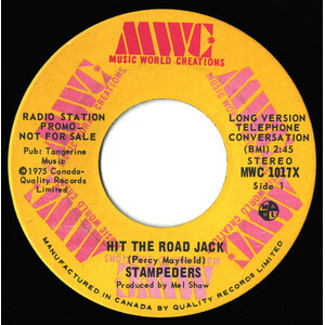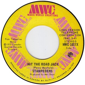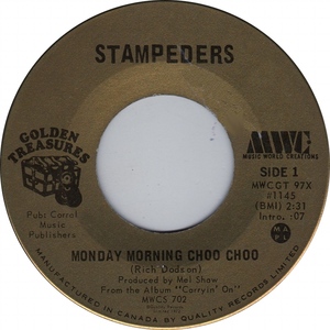 The trio's recording for MWC (Music World Creations, founded by the band's manager, Mel Shaw) of Dodson's "Carry Me" was a major Canadian hit in 1971. It was followed the same year by his "Sweet City Woman," an international hit. As a result The Stampeders received the 1971 Juno Award as vocal and instrumental group of the year. Though the success of "Sweet City Woman" typecast the band in a pop vein, its roots were in classic rock. The single "Wild Eyes" (1972) was the first to reflect this accurately. Other hits included "Devil You" (1971) and "Hit the Road Jack" (1975), both popular in the USA, as well as "Monday Morning Choo Choo" and "Then Came the White Man" (1972), and "Oh My Lady" and "Minstrel Gypsy" (1973).