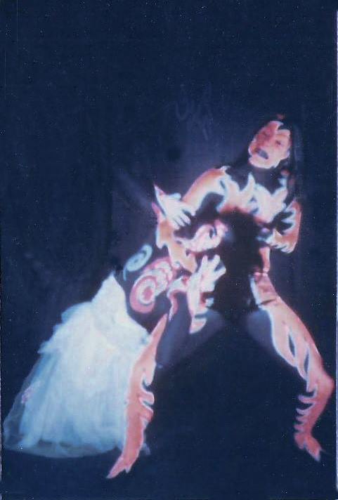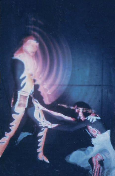 Our change to the show was such a hit we kept it in and built on it over the next year. First we changed to fluorescent paint and started painting our hands as well. Then we painted all our stage equipment then added black lights and a strobe light (very popular in dance halls). Eventually we incorporated a Liquid Light show as well, which had been becoming the "in thing" with West Coast groups. The first night we added the black lights we were even amazed at the results. But we couldn't stop there! We decided to make ours a visual show as well as musical one and built the whole last set around the paint and black lights. We planned the last set to be a build up from an easy opening to an energetic and thunderous ending. Two of the members (Nick and Jim) started wearing swimsuits and we painted their whole bodies. We put the Zappa tune at the end and we would all wear robes in the last set with the body paint hidden underneath.