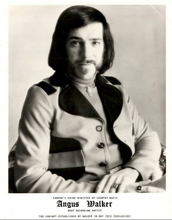In the 1970's, Angus began recording working with Ben Kerr in various capacities who helped him to make advances in promoting his career under the stage name of "The Prime Minister of Country Music". This name comes from a song Kerr wrote called "Parliament Hill" which in addition to other events, helped him to gain more exposure. Kerr was planning on having Angus run in the US election after recording "Washington D.C." until Angus suggested doing so in Canada instead. Shortly thereafter, Kerr had written the song which was promptly recorded and different versions were included on a single and an album. Angus toured prolifically during the time, performing not only at venues across Canada like McKoys in Gaspe and the Monteray Club in Montreal, but also in Hawaii where he met Steve Lau who eventually joined him back in Canada as the lead guitarist for his new band "The Cabinet" along with Henry Brennan on bass and Larry Brennan on drums. He gained more attention due to the controversial nature of "Parliament Hill", when the Government of Canada enacted legislation banning the further use of the title of the song for commercial use. At this point, Angus' musical style was mostly country inspired with other genres influencing him as well. Along with recordings on several compilation, albums and singles, including many that Angus wrote and other popular songs from the the time period, in 1973 he recorded and released "Introducing Angus Walker: Canada's Prime Minister of Country Music " with The Cabinet in anticipation of the extensive touring that would follow.