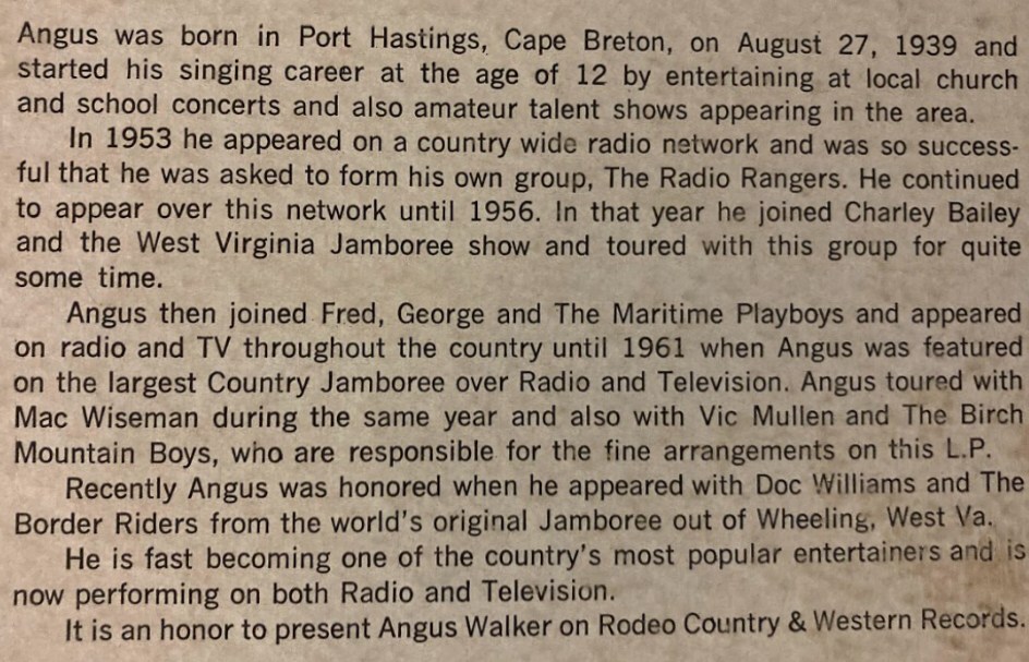 Ronald Spencer was an early musical mentor that was responsible for booking Angus' first live performance in Grand Anse, Cape Breton Island with Roland Wilkie playing tenor banjo, Knobbie Bro on accordion and Ronnie on steel top guitar. Angus, Ronnie and others also recorded at CJFX radio station in Antigonish, Nova Scotia.
