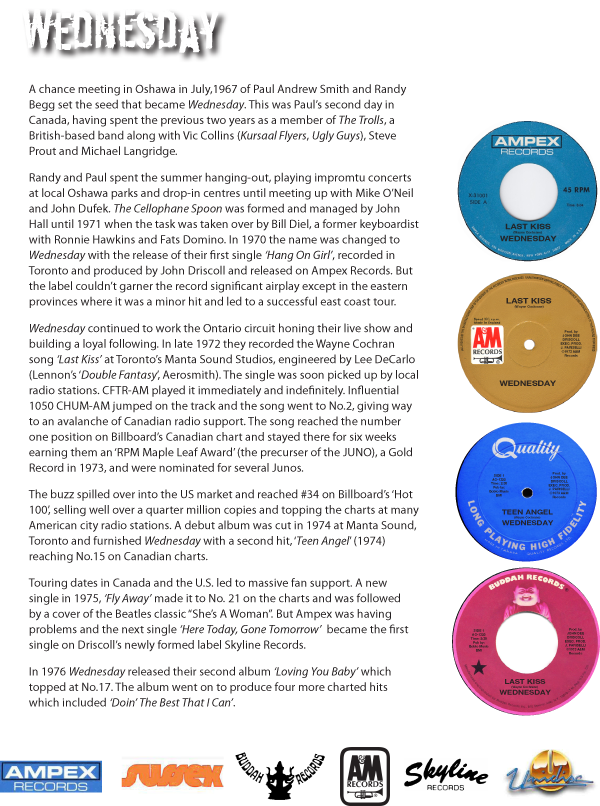 A chance meeting in Oshawa in July,1967 of Paul Andrew Smith and Randy Begg set the seed that became Wednesday. This was Paul’s second day in Canada, having spent the previous two years as a member of The Trolls, a British-based band along with Vic Collins (Kursaal Flyers, Ugly Guys), Steve Prout and Michael Langridge.