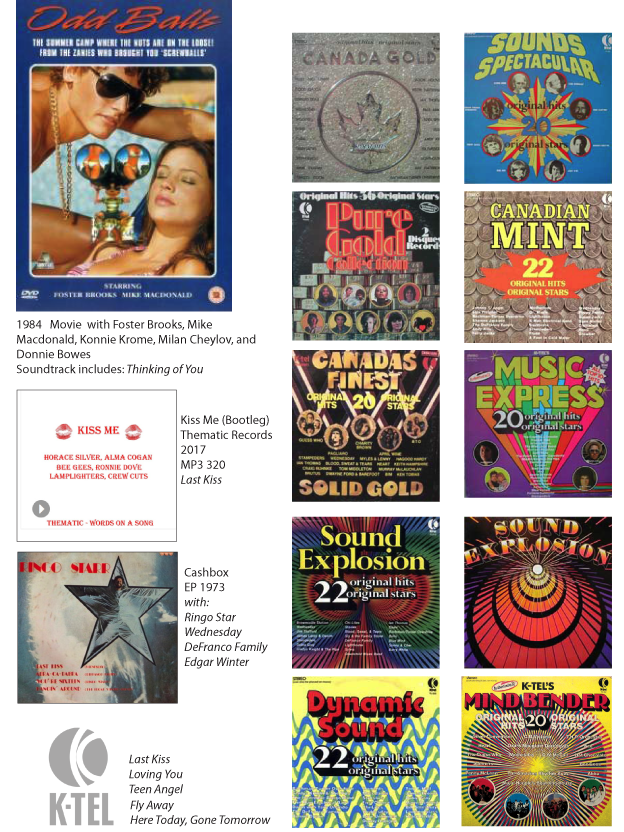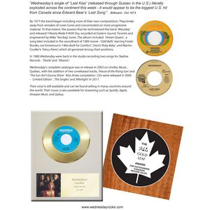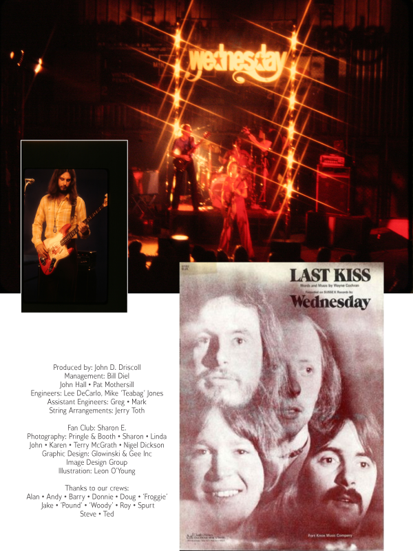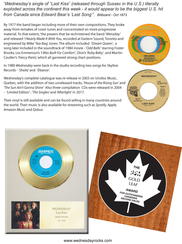 Wednesday continued to work the Ontario circuit honing their live show and building a loyal following. In late 1972 they recorded the Wayne Cochran song ‘Last Kiss’ at Toronto’s Manta Sound Studios, engineered by Lee DeCarlo (Lennon’s ‘Double Fantasy’, Aerosmith). The single was soon picked up by local radio stations. CFTR-AM played it immediately and indefinitely. Influential 1050 CHUM-AM jumped on the track and the song went to No.2, giving way to an avalanche of Canadian radio support. The song reached the number one position on Billboard’s Canadian chart and stayed there for six weeks earning them an ‘RPM Maple Leaf Award’ (the precurser of the JUNO), a Gold Record in 1973, and were nominated for several Junos.