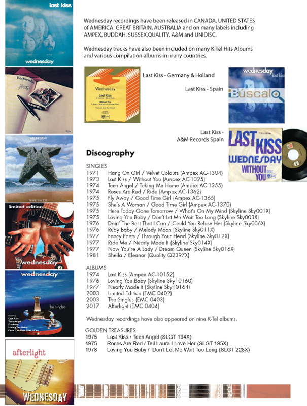 Wednesday’s complete catalogue was re-release in 2003 on Unidisc Music, Quebec, with the addition of two unreleased tracks, ‘House of the Rising Sun’ and ‘The Sun Ain’t Gonna Shine’ Also three compilation CDs were released in 2004 - ‘Limited Edition’ , ‘The Singles’ and ‘Afterlight’ in 2017.