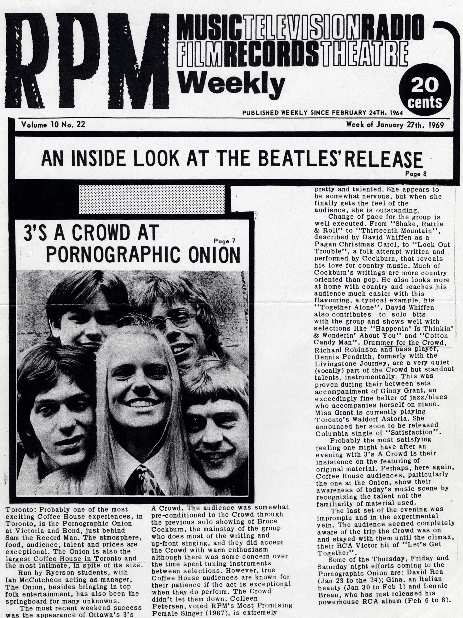 The exposure generated by the show nonetheless helped 3’s a Crowd to break out of the Canadian market. An important engagement at Steve Paul’s prestigious New York club, the Scene from 15-21 May was quickly arranged, while the band also made regular visits to the Back Porch Club in Columbus, Ohio. Another important showcase from that period was the annual Mariposa Folk Festival (Canada’s answer to Newport), held at Innis Lake near Toronto on 11-13 August.