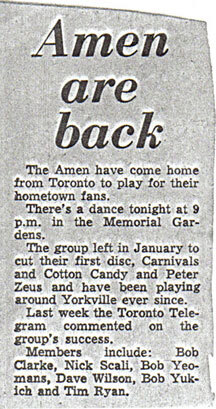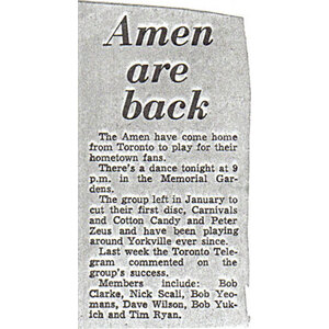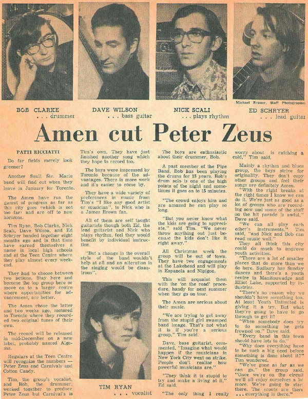 The Amen were a Canadian garage rock band formed in 1966 in Sault Ste. Marie, Ontario, and are remembered for their explosive live shows, tight musicianship, and the release of a single now cherished by collectors. The original lineup featured Tim Ryan (vocals), Ed Schryer (lead guitar), Nick Scali (rhythm guitar), Dave Wilson (bass), and Bob Clarke (drums), with later additions including Bob Yukich and Bob Yeomans.