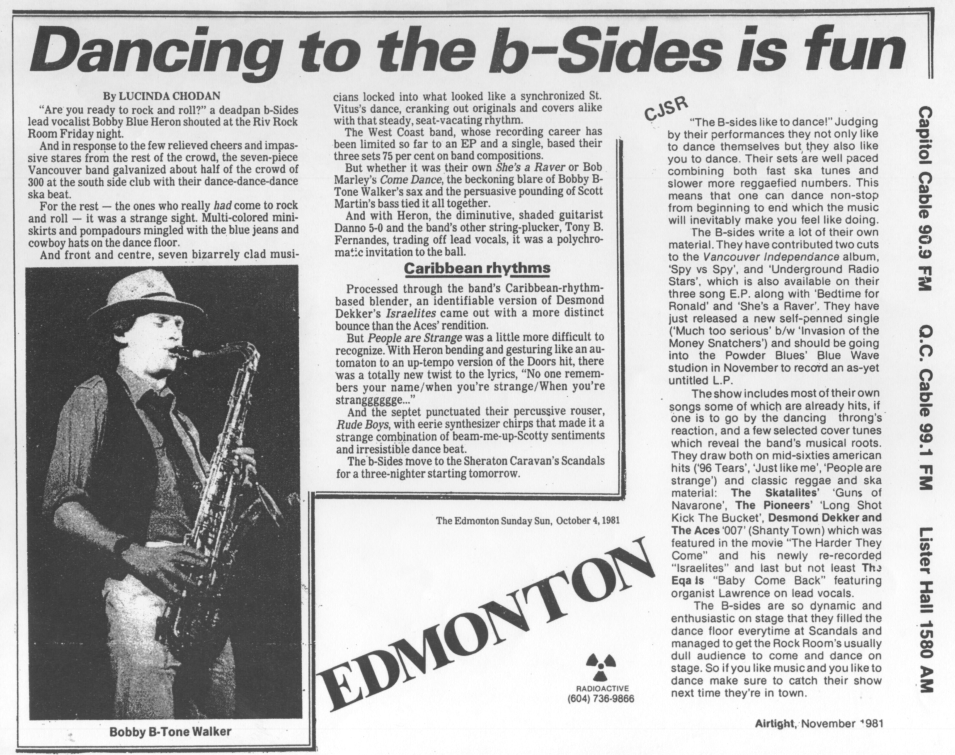 Describing themselves as “a modern dance band” with “essentially white reggae pop” roots, the B-Sides defied easy categorization. Their live shows were legendary, drawing sold-out crowds to venues like the Savoy, Town Pump, and Commodore Ballroom. In 1983, they were voted Best Club Band by the Georgia Straight, and their shows often broke bar sales records, including one week at Harpo’s in Victoria.
