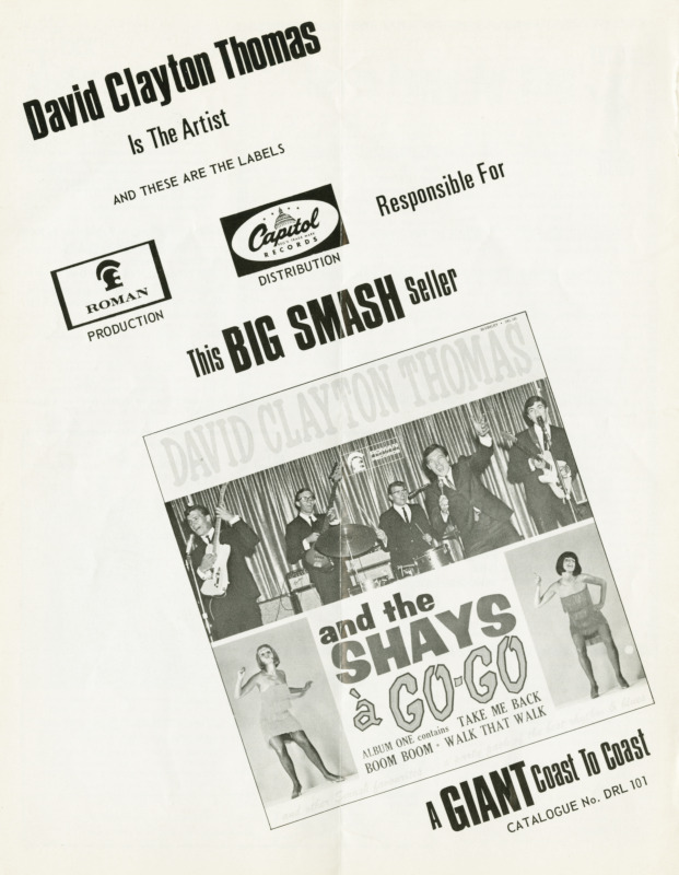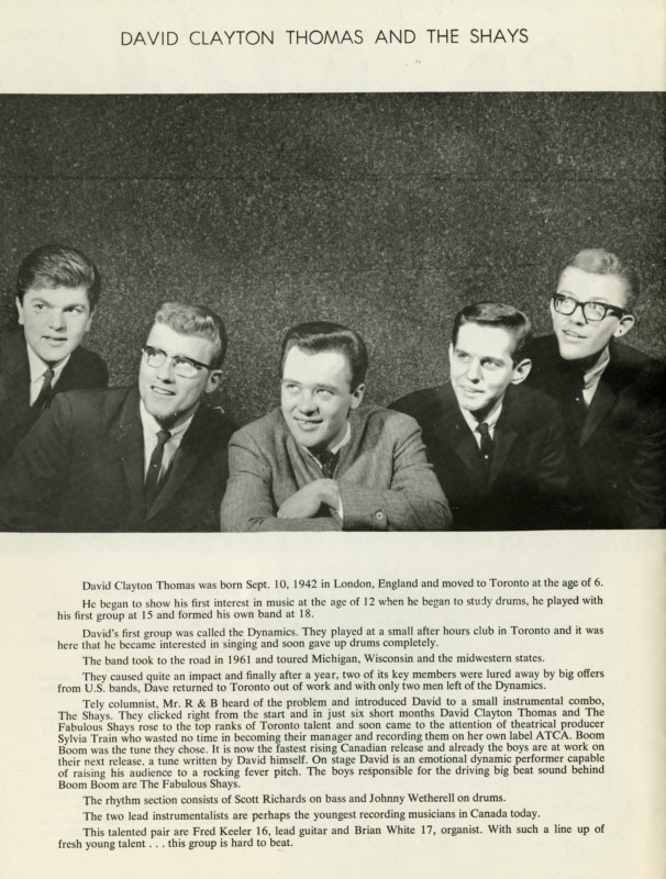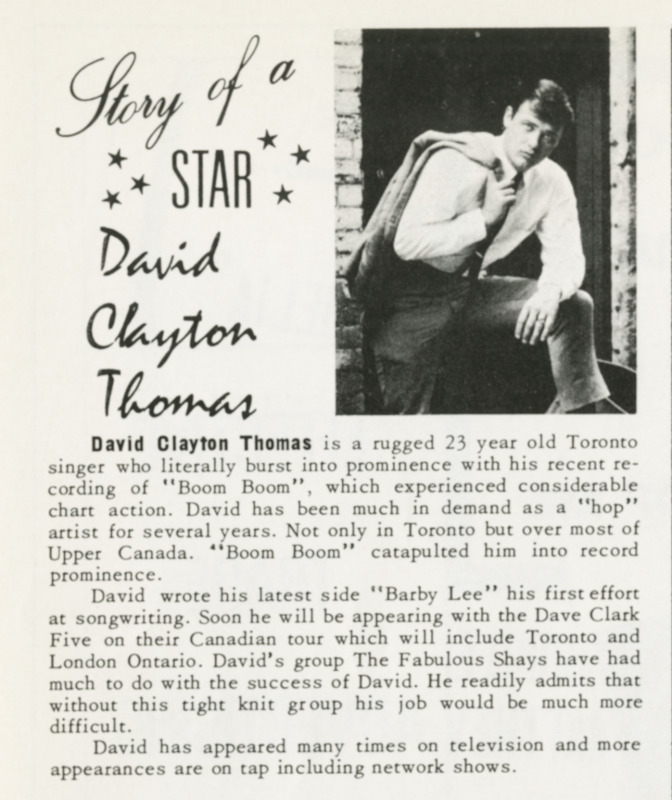 Clayton-Thomas’s first band, David Clayton-Thomas and The Fabulous Shays (later The Shays), was an R&B outfit that had hits in 1964 with “Out of the Sunshine” and “Walk That Walk,” a rendition of Hooker’s “Boom Boom.” They opened for the Rolling Stones at Maple Leaf Gardens and played the NBC-TV variety program “Hullabaloo” (1965) at the invitation of host Paul Anka.