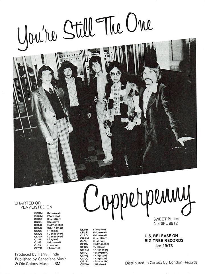 Producer Harry Hinde did a top-notch job recording the band at PAC 3 Studios in Dearborn, Michigan, capitalizing on Wamil's soulful vocals and going for more of an R&B sound with many of the songs. First up in late 1972 was Copperpenny's finest moment. "You're Still The One" featured group vocals, as well as harmony vocals from Tony Orlando's back-up group, Dawn. It remains a mystery why "You're Still The One," with an improved intro for the single version, never hit the top of the charts. It did, however, give Copperpenny its first top 40 hit, peaking at number 26 nationally and number 16 in Toronto. However, the next single would become their signature song and biggest hit. "Sitting On A Poor Man's Throne" peaked at number 14 in 1973, even though the song had been shortened by almost 2 minutes to make it suitable for hit radio. (Note: The full length version can be found on the vinyl album of the same name. The only versions that have made it to CD have also been shortened. Brian Chater, who now owns Copperpenny's recordings on Sweet Plum, has been quoted as saying, "There had been no use putting it out because there isn't a group anymore." That statement makes it pretty clear what is wrong with the industry today. Executives in the music business aren't even music fans. It's a good thing Chater doesn't look after The Beatles' catalogue.)