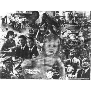 To celebrate the March 1987 release of Dead Dogs, Dog Meat BBQ played a special show at the Cornerstone, a "video disco" on George Street in St. John's. To spice up this show, the band decided to put the club's giant video screen to use. Wallace and Mike put together a video collage presentation which ran on the screen behind the band throughout their two sets. It included footage from war movies, cartoons, the news, soap operas and whatever else they could come up with. Pictures and a review of this show can be found elsewhere on this website.