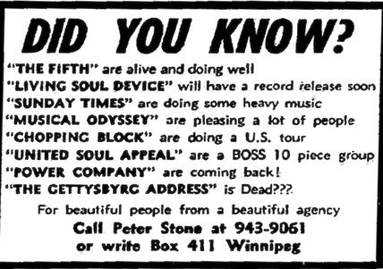 1968 saw the release of two more singles - Sunshine People (b/w Don't Worry About Me Babe) and All I Want is Love (b/w Caprice). By the close of 1968, The Fifth had become one of the most popular and dynamic groups on the Winnipeg music scene, and named one of the top three bands in the city.