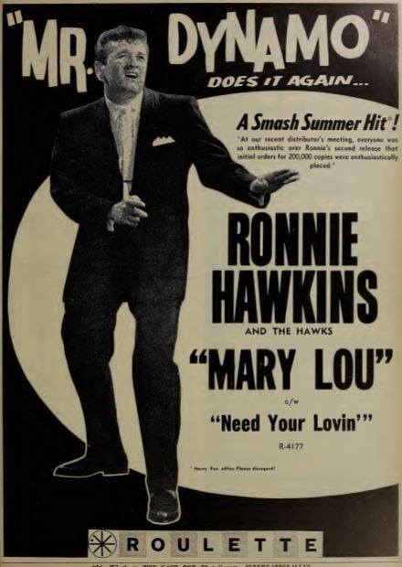 In 1958 his hit, “Hey, Bo Diddley” was released. This was followed by "Marylou", which turned Hawkins into a teenage idol. In 1959, Morris Levy signed him to Roulette Records for five years and tried to lure him back to the United States but Hawkins had fallen in love with Canada and didn't want to leave his new home.