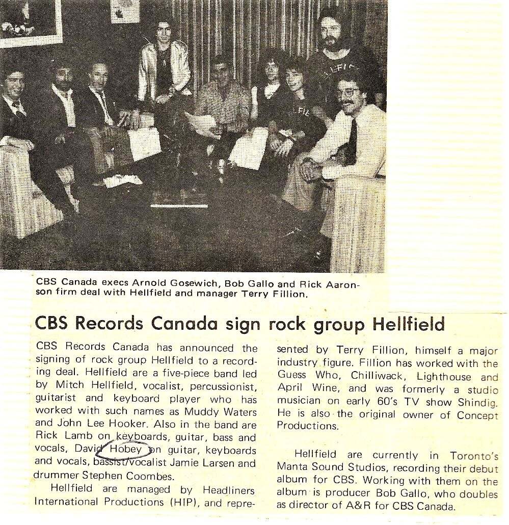 With Gallo and CBS Canada president Arnold Gosewich acting as producers, Hellfield released their self-titled debut on Epic in '78. A combination of hard rock and power-pop, the album contained two singles, "Too Late", followed by "Tell Me Are You Listening". Both tracks gained significant FM airplay here in Canada and the album sold well in the US as an import, also due in part to such tracks as "Magic Mistress" and "Fancy Nancy". But despite the band's initial success, Gallo felt some changes were needed. Unhappy with the work of Coombs, he recommended a new drummer. In fact, it was Field himself who sat behind the kit for much of the first record. Enter new drummer Billy Smith.
