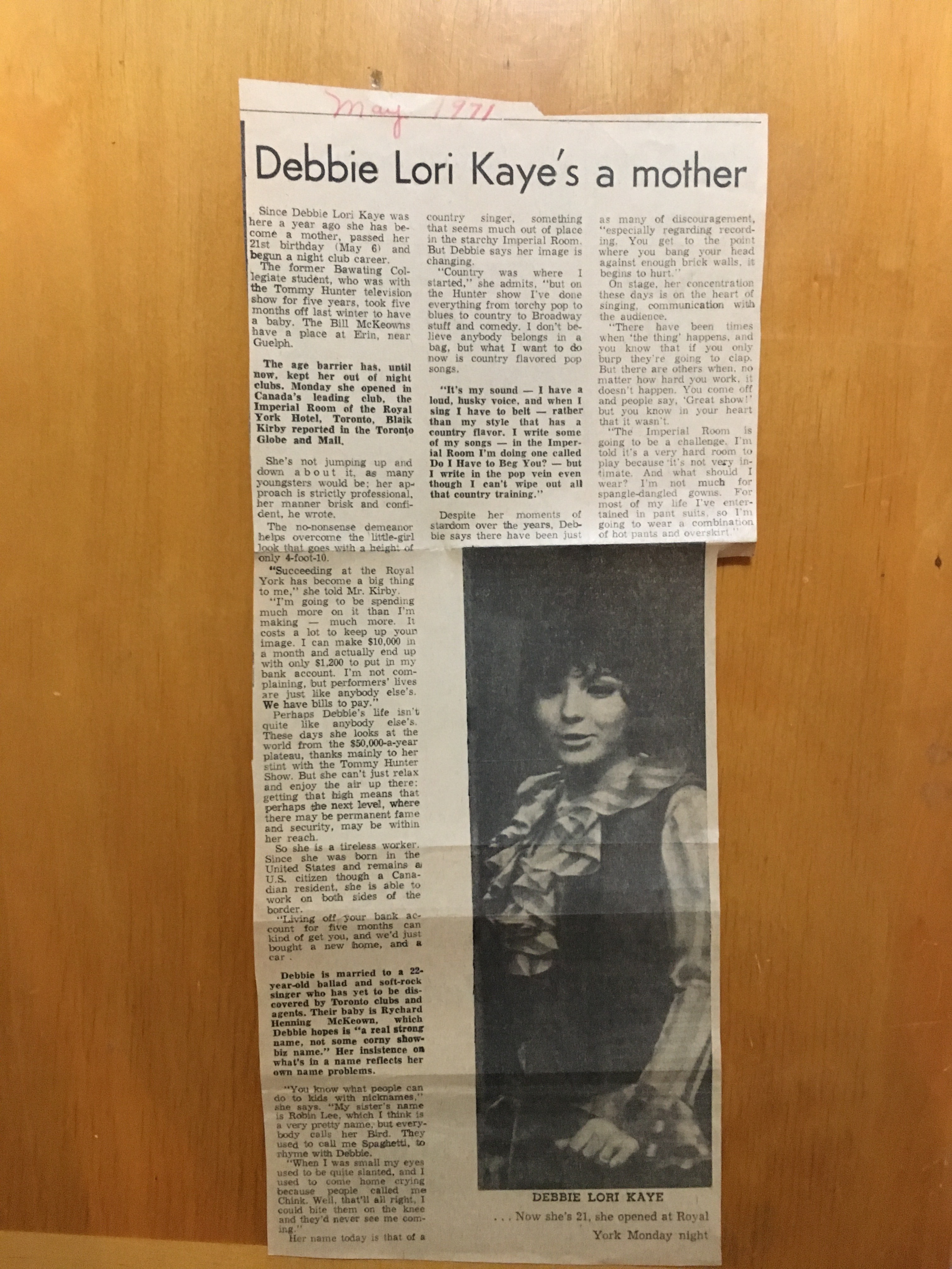 In 1964, local songwriter Pat Bestall (son of CKCY manager Al Bestall) wrote a song for Debbie titled "Picking Up My Hat." It was first recorded during a live mall show at Stedmans and sent by Al to Columbia Records in Nashville. The timing was ideal, producer Frank Jones of Columbia Records invited Debbie to Nashville, and in early 1965, Columbia signed her to a seven-year recording contract. While recording in Nashville, Debbie recalled meeting a young Kris Kristofferson in the Columbia studios. “He was just a guy with a guitar back then,” she said, “but you could already tell there was something special.”