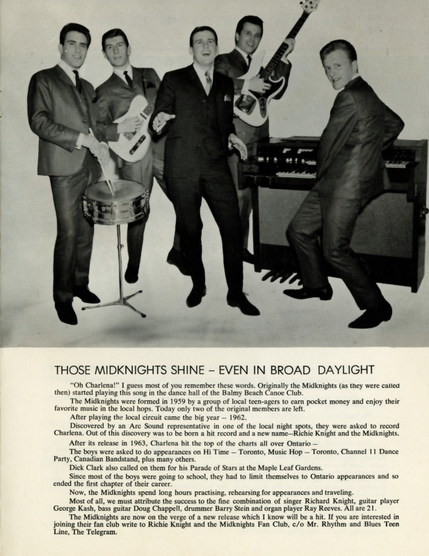 The Mid-Knights’ sudden success transformed their fortunes overnight. They headlined dances at Balmy Beach Canoe Club, Mazaryk Hall, the Jubilee Pavilion in Oshawa, and The Pav in Orillia. Maple Leaf Gardens even came calling: first as part of Dick Clark’s Cavalcade of Stars in 1963, then again in 1965 when they opened for the Rolling Stones.