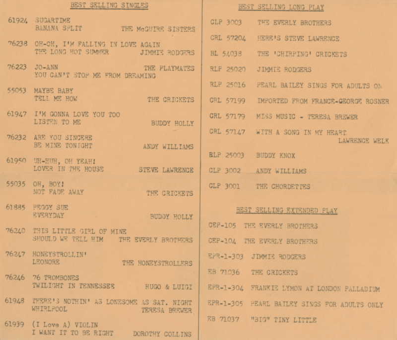 The first release was "Party Doll", and then at almost the same time Roulette released "I’m Sticking With You". With "Party Doll" going number one and selling well over a million singles and "I’m Sticking With You" being a top 40 hit and single sales over one million, the band was on top of the world. That same year Buddy Knox and the Rhythm Orchids released "Rock Your Little Baby To Sleep", a top 20 hit, and "Hula Love", a top 10 hit. Both singles sold over one million copies.