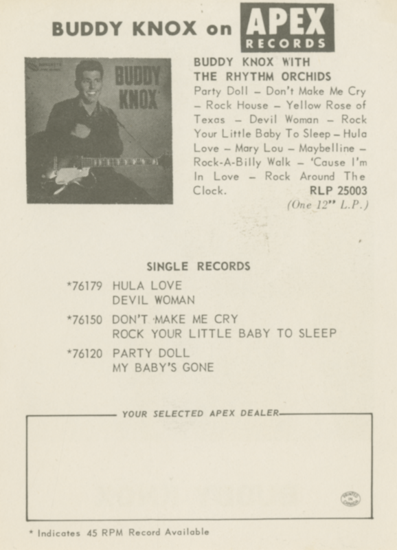 The year of 1957 was over and Buddy Knox and the Rhythm Orchids had 4 million selling singles to their credit. To this day "Party Doll" is still one of the most played songs from the 50’s rock ‘n roll craze, and single sales to date are well over 10 million copies. That’s not bad for a guy from Happy Texas, population 690.