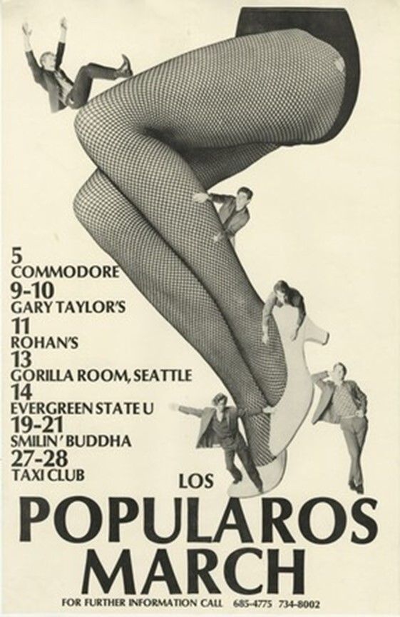 In late 1980 Armstrong and Scherk were reunited in Los Radicos Popularos, a so-called fuck band that also included Art Bergmann, Tony Bardach, Zippy Pinhead and sometimes Gord Nicholl. By February 1981, with the demise of the Young Canadians and Modernettes, the band shortened their name to Los Popularos and became a full-time project. Los Popularos released two records: the 7-inch single Working Girls b/w Mystery To Myself (1981) and the Born Free 12-inch EP (1982). Los Pops toured North America a couple of times, but eventually called it quits in winter 1983. The following spring, Art Bergmann formed Poisoned, and went on to a long and storied career as a solo artist.