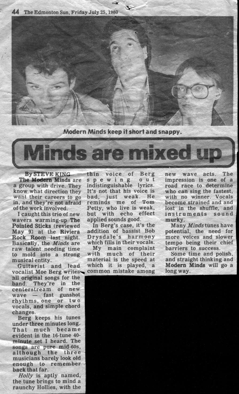 A July 1980 Edmonton Sun review described a 16-song, 40-minute set as “pure mid-60s,” citing Moe Berg’s vocals as “thin” but enthusiastic and supported by Drysdale’s harmonies. While critiquing the band’s tendency to play at breakneck speeds, the review praised their drive and raw potential: “Some time and polish, and straight thinking, and Modern Minds will go a long way.”