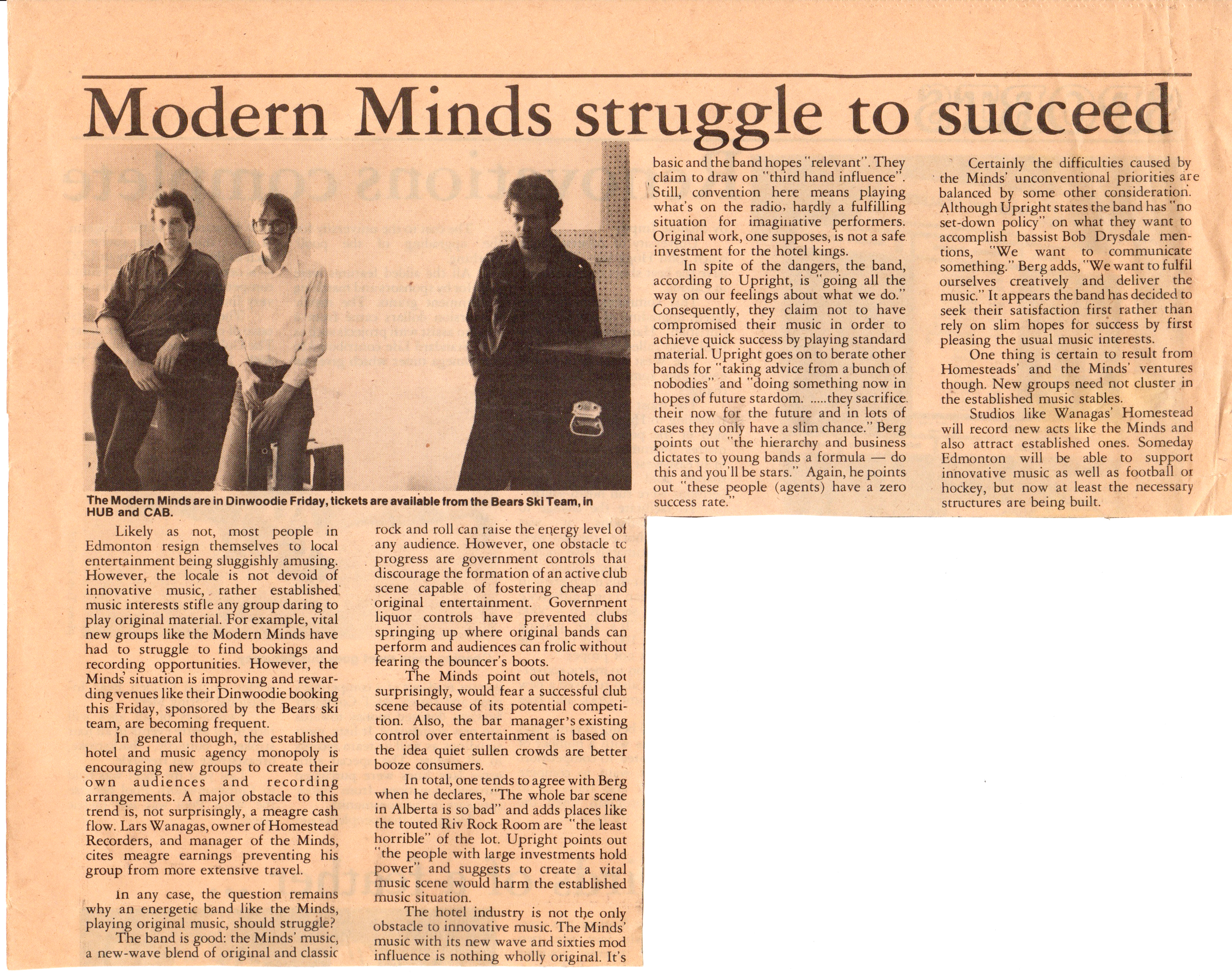 In 1977, while still students at Paul Kane High School, Upright and Drysdale met Moe Berg, then in Grade 10, and began jamming together—first bonding over Neil Young and Deep Purple covers. That connection quickly solidified into a songwriting unit focused on original material, and Modern Minds was born. Early performances as The News included a debut at Borden Park and regular gigs at the Corona Hotel, eventually transitioning into Modern Minds in early 1980.