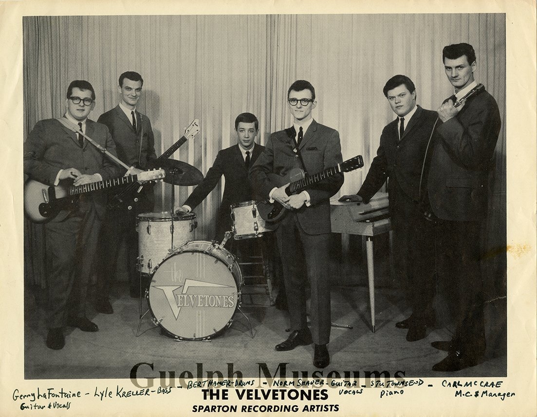 The Velvetones including Norm Shaver, Gerry LaFontaine, Lyle Kreller and MC and manager Carl McCrae (Stu Townsend and Bert Hamer are partially visible along the right side of the image)