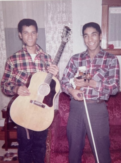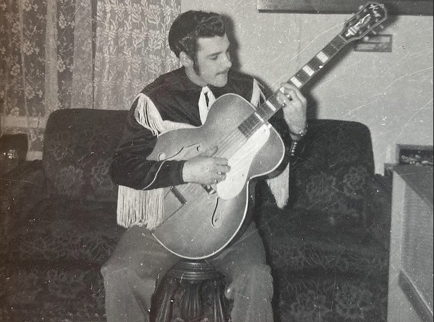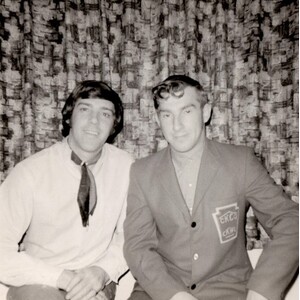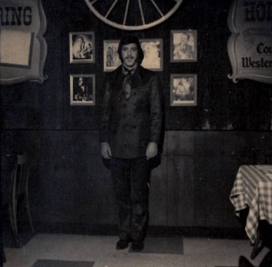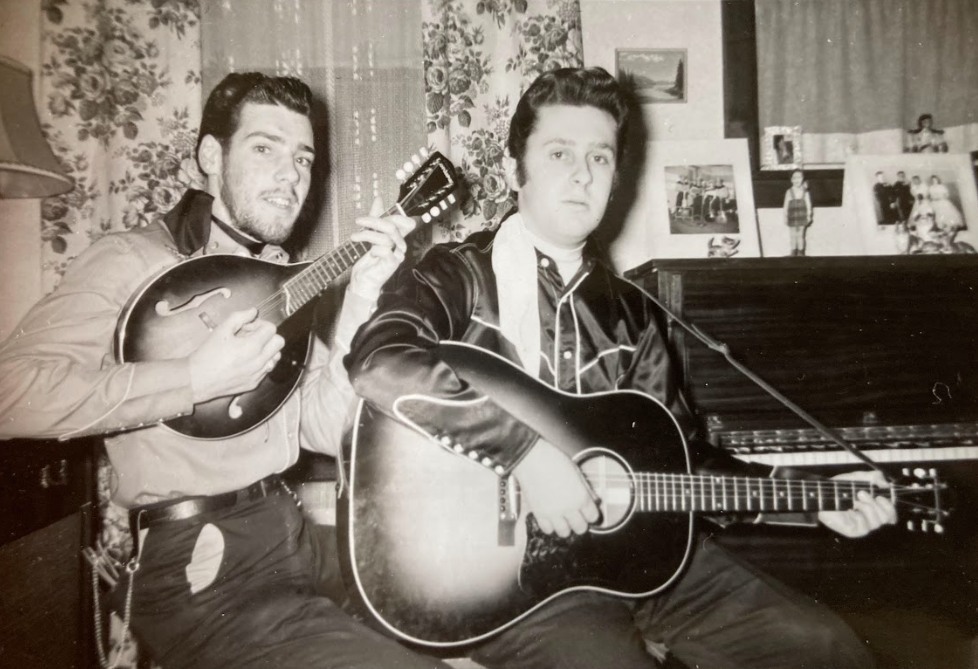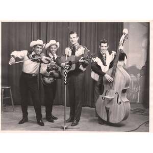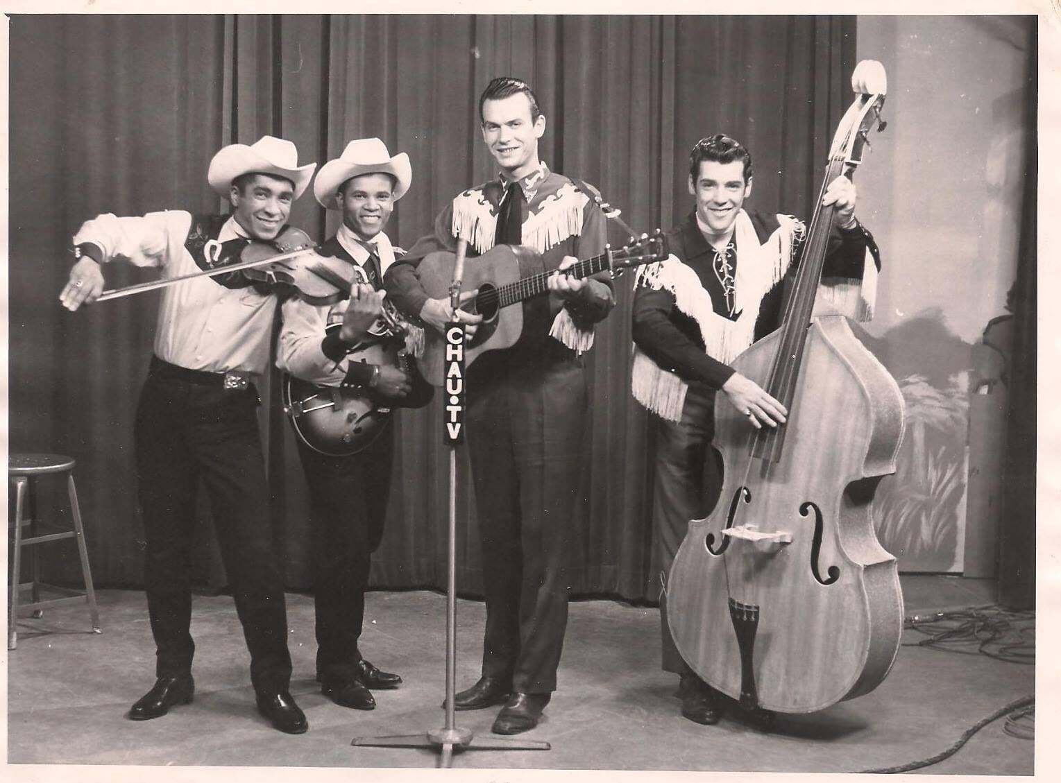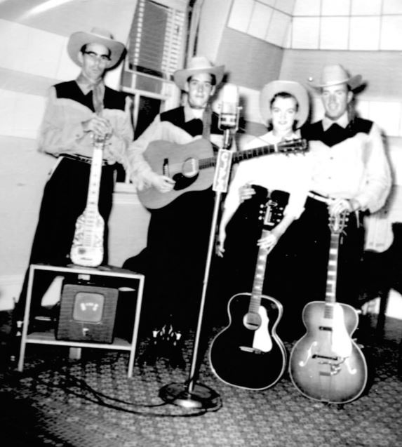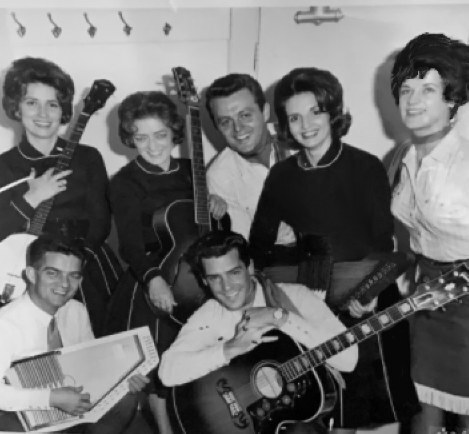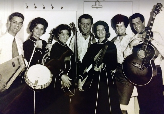 backstage Montreal Forum Sept 4, 64 during big package show CFOX mid 60's incl Bill Anderson, Web Pierce, Carter family w/ Doug Trineer & The Hackamores L-R Paul Menard, Helen Carter, Mother Maybelle Carter, Dougie Trineer, Anita Carter, June Davey & me