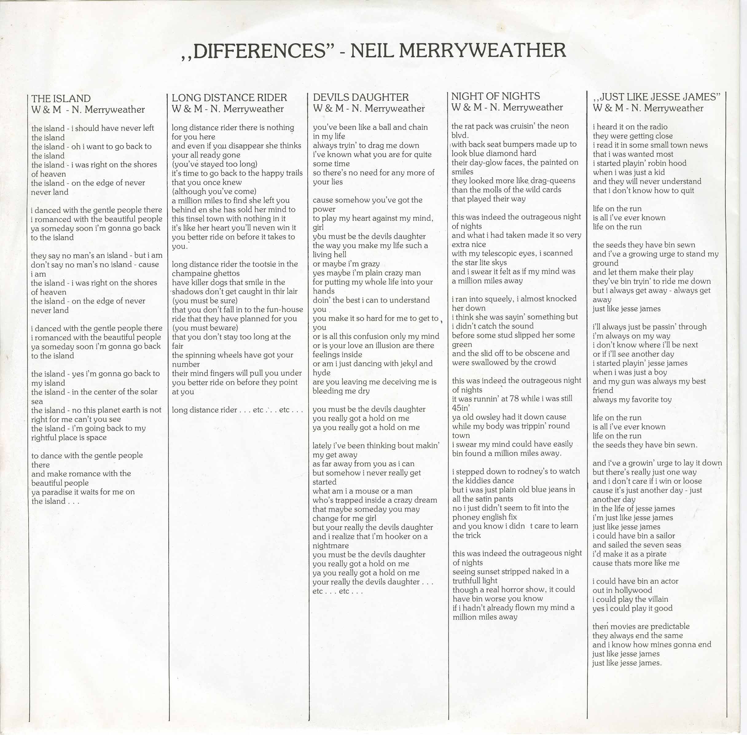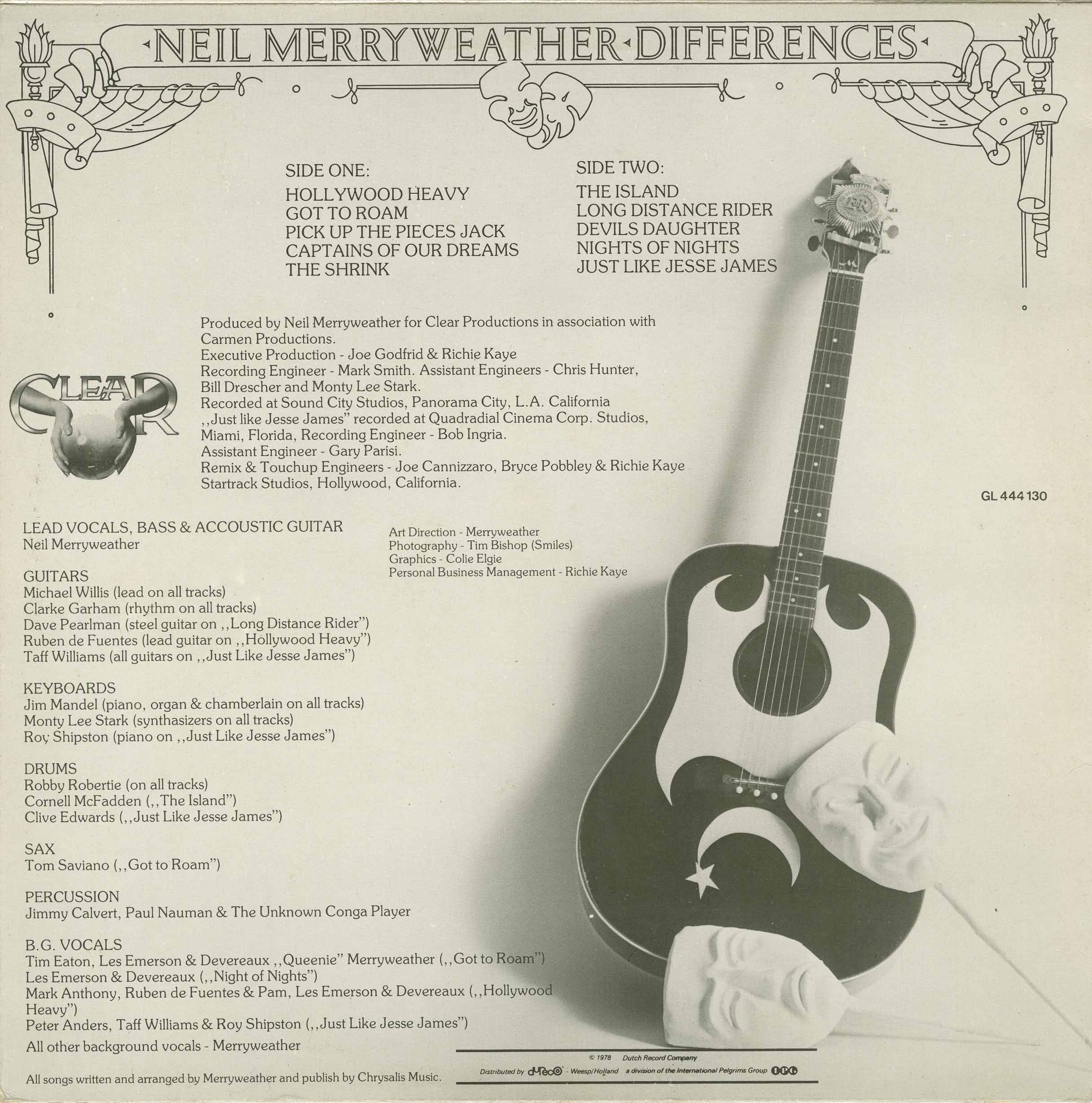 Merryweather produced two singles for a three-girl-singing-trio he called "Band of Angels", one on Mums Records and one on Midland International. He did three albums at Sound City, The Hollywood Stars, solo artist Kyle, and his own album. Neil recruited Mike Willis and a bunch of his musician friends to record his new album with the help of engineer Mark Smith (Bachman-Turner Overdrive) at the controls. Neil then went to London England. Ann Munday, the head of Chrysalis Music Publishing signed Neil to a publishing deal upon hearing the Sound City recordings. It was through the Chrysalis Music deal that Dureco Records in Amsterdam heard Neil's Sound City recordings and signed Neil to a record deal to release the album. Neil named the album Differences due to the variety of writing styles it featured. Dureco asked Neil to produce a slew of Dutch bands that were signed to them. One band was called Carlsberg. Neil produced the Carlsberg album and it did well locally in the Netherlands. His deal with Dureco was to include a new Neil Merryweather album. While Neil recorded new demos for Chrysalis in London he found musicians Dave Sinclair (Matching Mole and Camel keyboardist) and Clive Edwards (Pat Travers, UFO and Wild Horses drummer) and guitarist Taff William (Bonnie Tyler and Eyes of Blue). Neil ran into Jethro Tull's road manager at Chrysalis and he told him of a great new studio in Miami. Neil called the studio and made arrangements to take his new group there to record the new album. Dureco refused to pay the bill to fly Dave Sinclair's custom Hammond organ to Miami. Dave wouldn't record without his personal gear so he was replaced by Roy Shipston, a friend of Clive Edwards. That was just the beginning of the Dureco Records situation as Neil was informed his budget was reduced by half when he arrived in Miami with the band. A week of sessions produced some fine recordings but only one song found its way onto the Differences album just before it was released. The other songs were only on a Dureco sampler. Neil turned to Cees Wessels the ex-head of Phonogram Holland. Cees was a huge fan of the Space Rangers and now was the new head of RCA in Amsterdam. Neil met Cees for coffee and they inked a deal for Neil to sign with RCA. Neil flew Mike Willis from the Space Rangers over to Amsterdam and they recruited Kees Meerman, the drummer from Herman Brood's Wild Romance and Ken Spence, a saxophonist from Nina Hagen's big band. Neil called the band 'Eyes' and the album Radical Genes was recorded. The band played locally around Amsterdam and they performed at the Hell's Angels Jamboree, but folded soon after due to friction between band members. Neil decided to return to LA.
