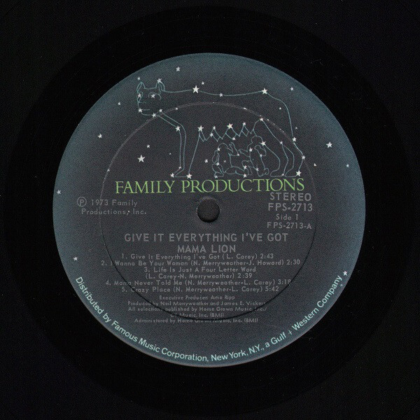 Neil Merryweather and Lynn Carey, along with guitarist Kal David and former Merryweather bandmates Roth and Hall, recorded the Vacuum Cleaner album for RCA in 1971. Two tracks that they recorded at Kent Records under the name "Momma and Pappa Rock'n Family" (Kent 4522) were bought by RCA, also found their way onto the Vacuum Cleaner album. Neil was not happy with RCA firing the A&R staff that signed them and found the replacement staff to be weak and he left with the idea to form a new group with Lynn out front. Neil recruited Coffi Hall as drummer and found guitarist Rick Gaxiola and keyboardist James Newton Howard. Merryweather had put together a new hard rock band which he named Mama Lion in 1972, featuring Carey on lead vocals. He produced a "demo" recording at Paramount studio and played it for some friends and it caught the ear of Ken Mansfield. Ken Mansfield became the new band's manager and within a week sold the band to Artie Ripp's new Family Productions label, which was a new affiliate of Famous Music. The band recorded two albums, Preserve Wildlife (which featured Neil's idea of a controversial photo of Carey appearing to nurse a tiger cub) in 1972 and Give It Everything I've Got in 1973. Merryweather also recorded with the Mama Lion lineup sans Carey, with this band calling itself Heavy Cruiser. They released two albums, the eponymous Heavy Cruiser (1972) and its followup, Lucky Dog (1973). The band was offered a management contract with Shep Gordon and was booked to open for Alice Cooper on his upcoming world tour. Ripp scuttled the deal by quickly stealing the management. The Alice Cooper tour was lost and the beginning of the end for the band started from that day on. After a few small tours of small clubs was arranged by Ripp's management Mama Lion wound up in Europe where a series of events due to bad management and internal disputes caused Neil to let guitarist Rick Gaxiola go. He replaced Rick with Alan Hertzberg from Billy Joel's band. Neil produced the second Mama Lion album Give It Every Thing We Got starting it in New York and finishing it in Los Angeles. The internal friction in the band partly caused Lynn Carey's substance abuse and Ripp's constantly saying that she was Mama Lion and not the band. Neil saw the band Mama Lion coming apart and after finishing the production of the album he quit. The double album that he produced was cut down to a single album and the title was changed to Give It Everything I Got. The cover featured Lynn Carey alone without a band member anywhere. Ripp and Carey achieved what they wanted and the band was sent back to Europe for another string of weak tour dates. The band broke up in Paris and the band members left, leaving Lynn Carey there to pick up the pieces. What Neil saw would happen came to a bitter end.