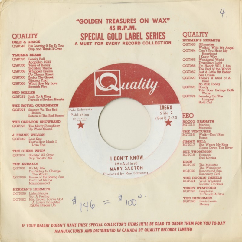| Saxton, Mary | I Don't Know | Wander By b/w I Don't Know | 02:38 | |