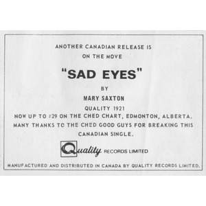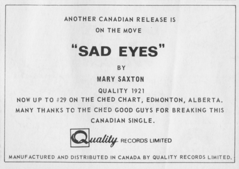 | Saxton, Mary | Sad Eyes | Sad Eyes b/w Take My Heart | 03:05 | |