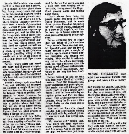 As Telfer recalls, the musicians had a ton of fun doing the album, but when it came to selling it, Finkelstein asked the late Felix Pappalardi, who’d produced Kensington Market but was turned down. The album was never mentioned again and Telfer lost his copies of the tapes. Over the years, Finkelstein also lost his.