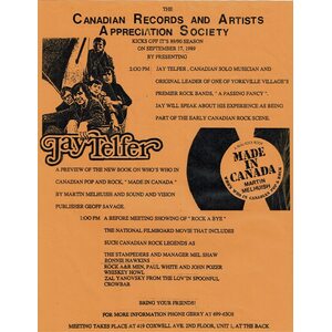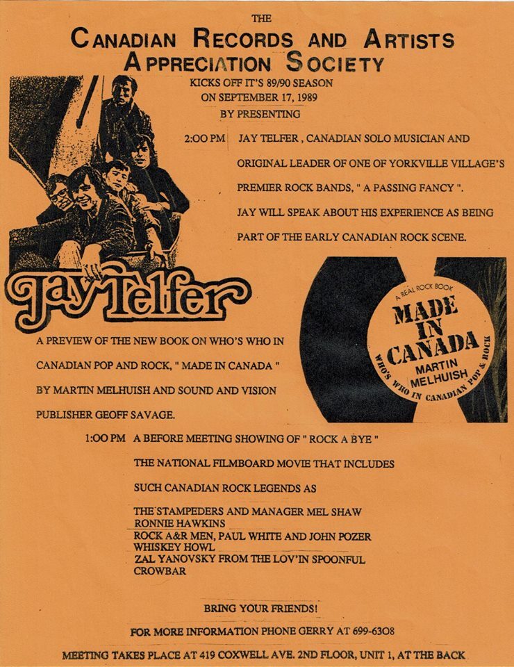Toronto singer/songwriter and multi-instrumentalist Jay Telfer is arguably best known for his work with 1960s rock group, A Passing Fancy, and for penning Steel River’s hit, “Ten Pound Note”. Starting out with folk group, The Voyageurs at the age of 14, Telfer befriended future Bruce Cockburn manager Bernie Finkelstein, who was responsible for bringing the promising singer/songwriter into the ranks of The Dimensions and renaming the band, A Passing Fancy in 1965.