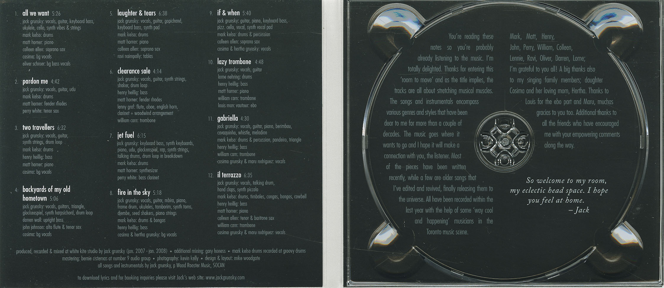 Jack's expertise extended beyond performance. As a producer and mixer, he collaborated with fellow artists, including Fred Penner, whose Sing With Fred won a JUNO Award. Jack also explored other genres, releasing Coastlines (2006), a NuJazz instrumental album, and Room To Move (2008), blending folk, jazz, and bossa nova.