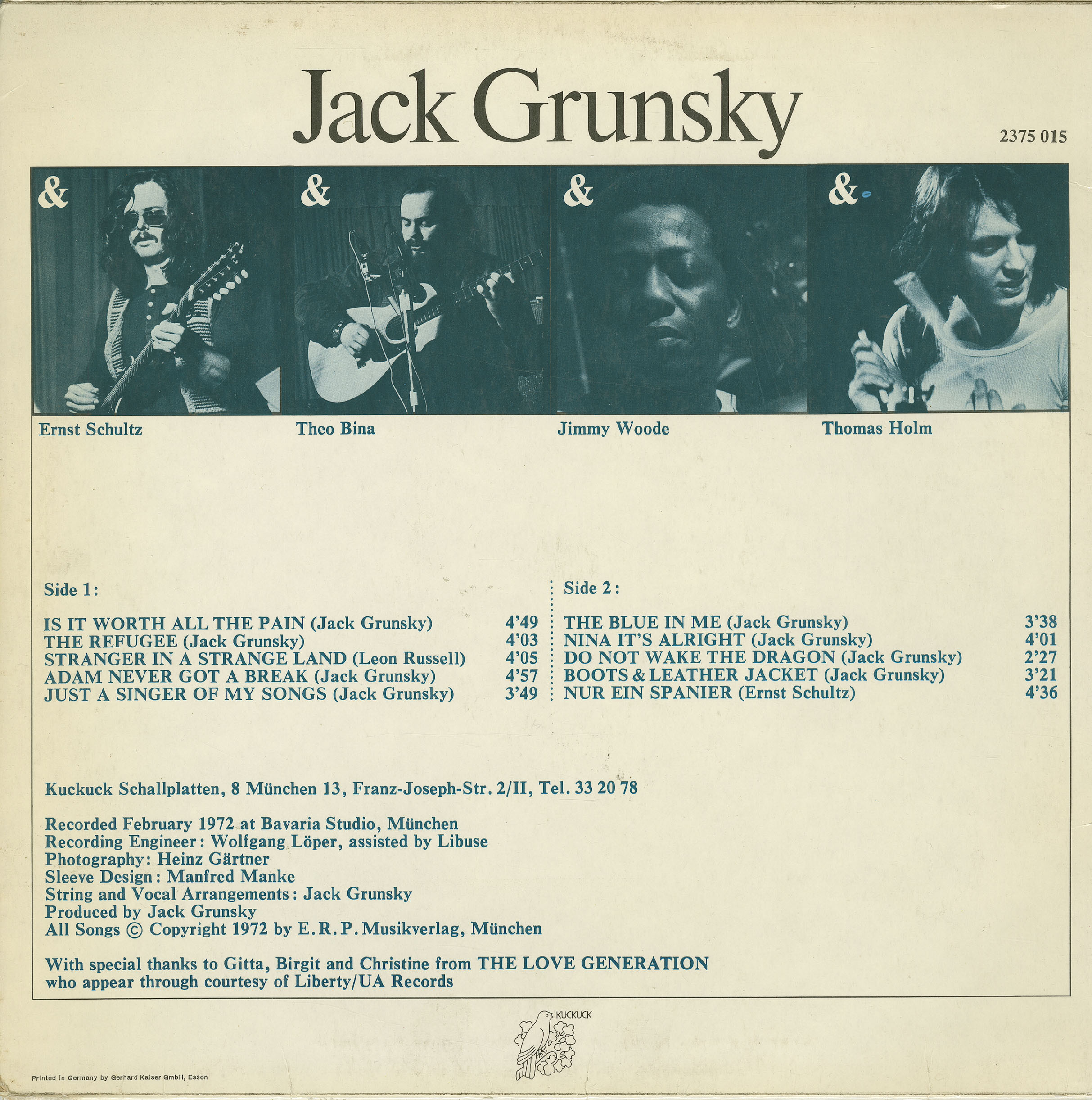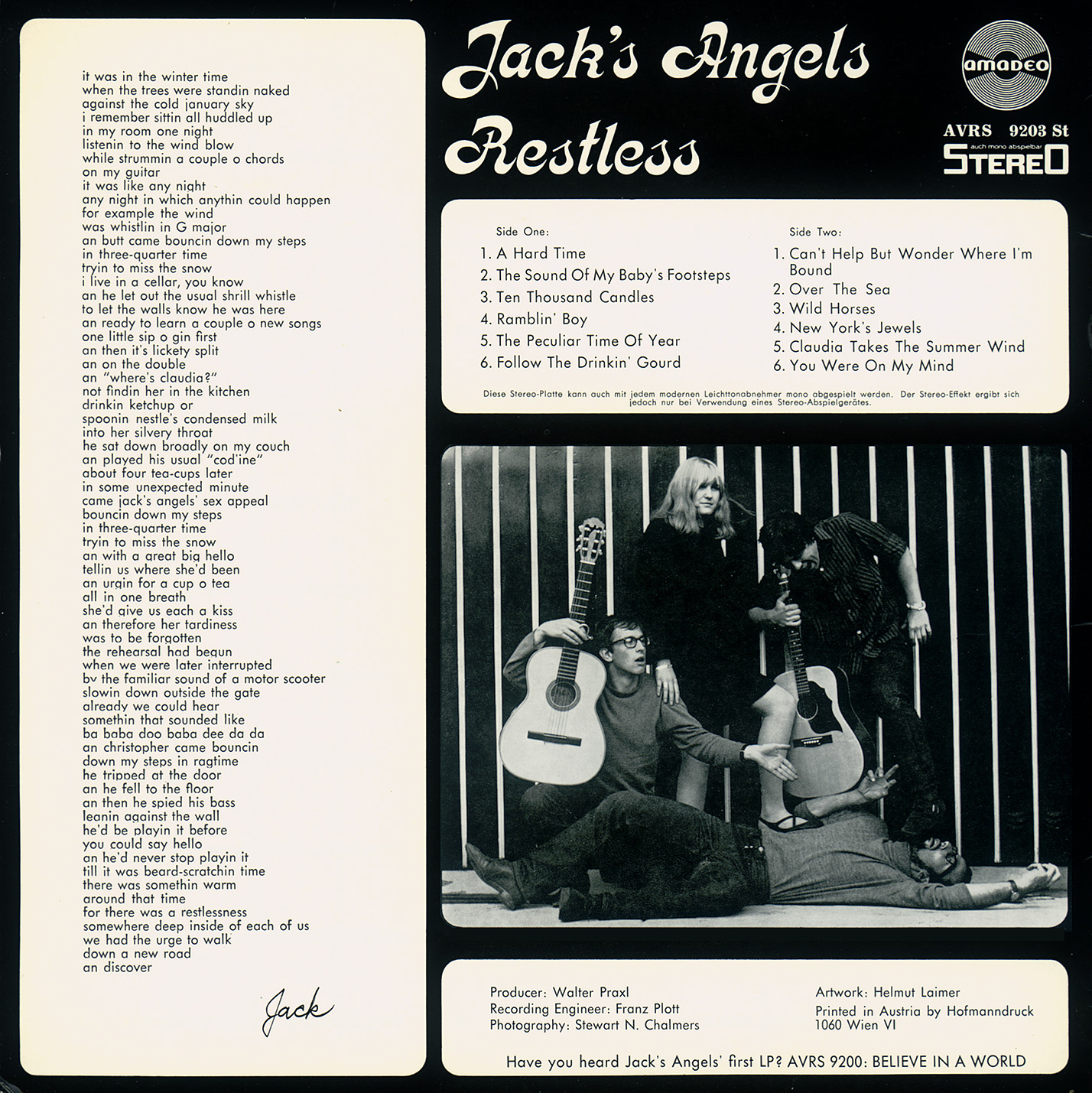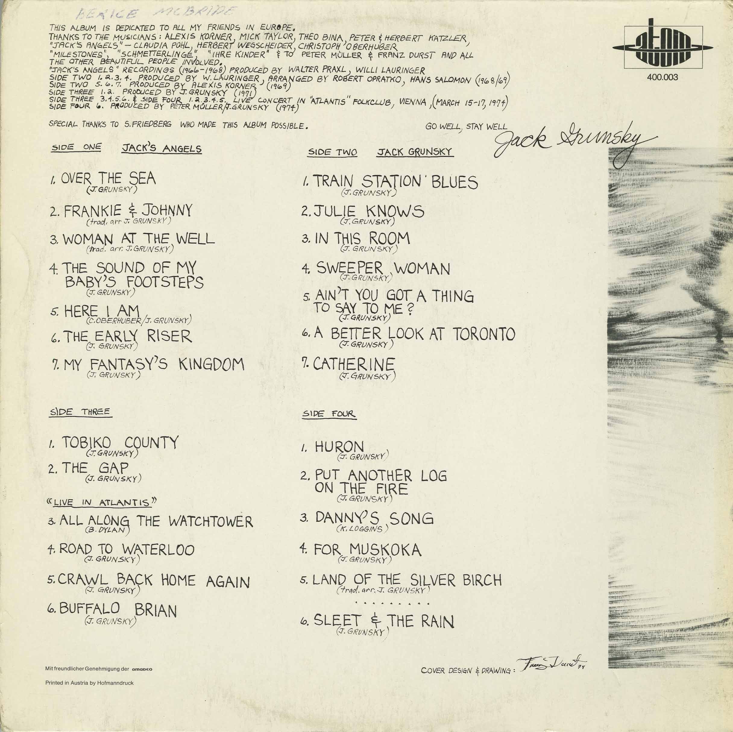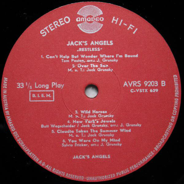 After high school, Jack returned to Austria and attended the Academy of Arts in Vienna. It was during his art school years that his music career began to flourish. In 1966, he formed Jack’s Angels, a folk group that recorded four successful albums with Amadeo Records in Vienna. After the group disbanded, Jack continued as a solo artist, releasing three albums: The Way I Want To Live, My Ship, and Toronto (produced by Alexis Korner and featuring Mick Taylor of the Rolling Stones).