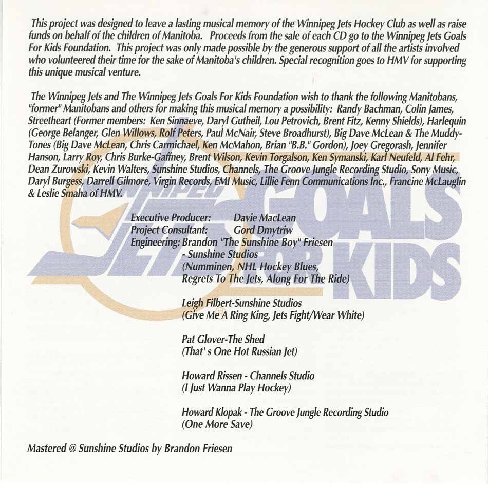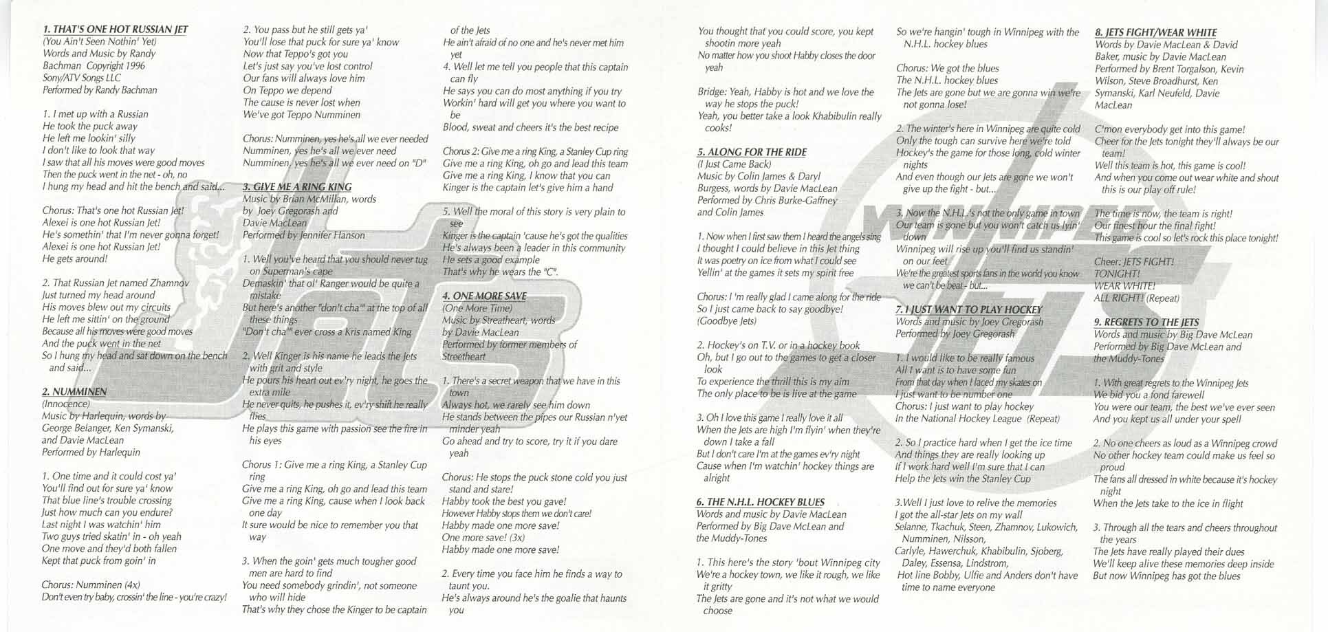 The album featured a collection of songs performed by notable Canadian artists who volunteered their talents to commemorate the Jets' impact on the community and hockey culture. Among the standout tracks was Randy Bachman’s spirited tribute to Alexei Zhamnov, titled "That's One Hot Russian Jet," and Harlequin’s energetic homage to Teppo Numminen, simply titled "Numminen." These tracks captured the energy and skill of the team’s beloved players, making them instant fan favorites.