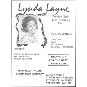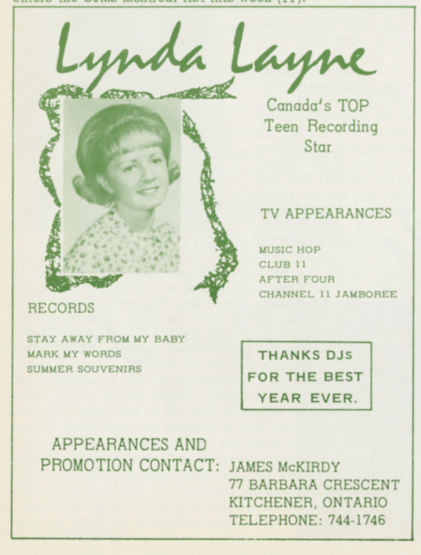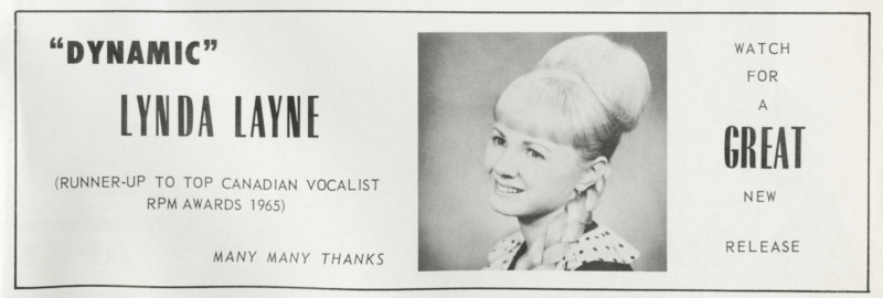 Soon adopting the stage name Lynda Layne, she quickly found her footing in the Canadian music scene through television. She became a regular on CBC’s Music Hop beginning in 1964 and appeared on programs like Juliette, Teen ’67, and CHCH-TV’s Jamboree. That same year, she was named “Most Promising Female Vocalist” by RPM Weekly—Canada’s premier music industry journal.