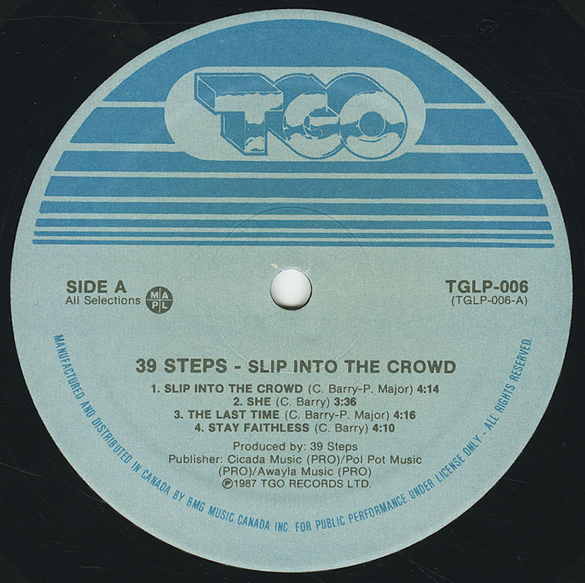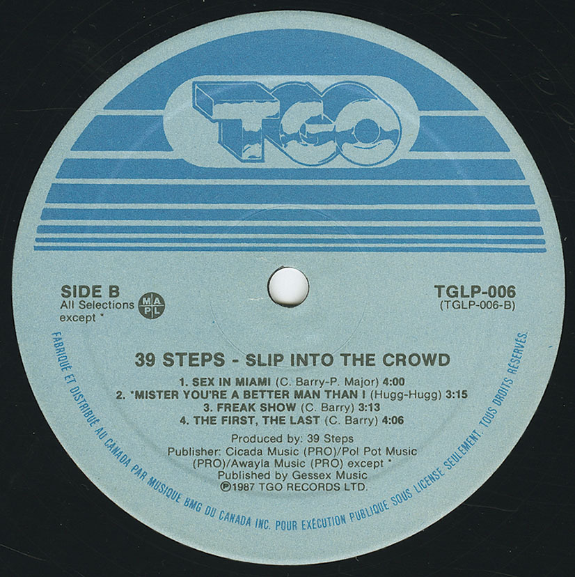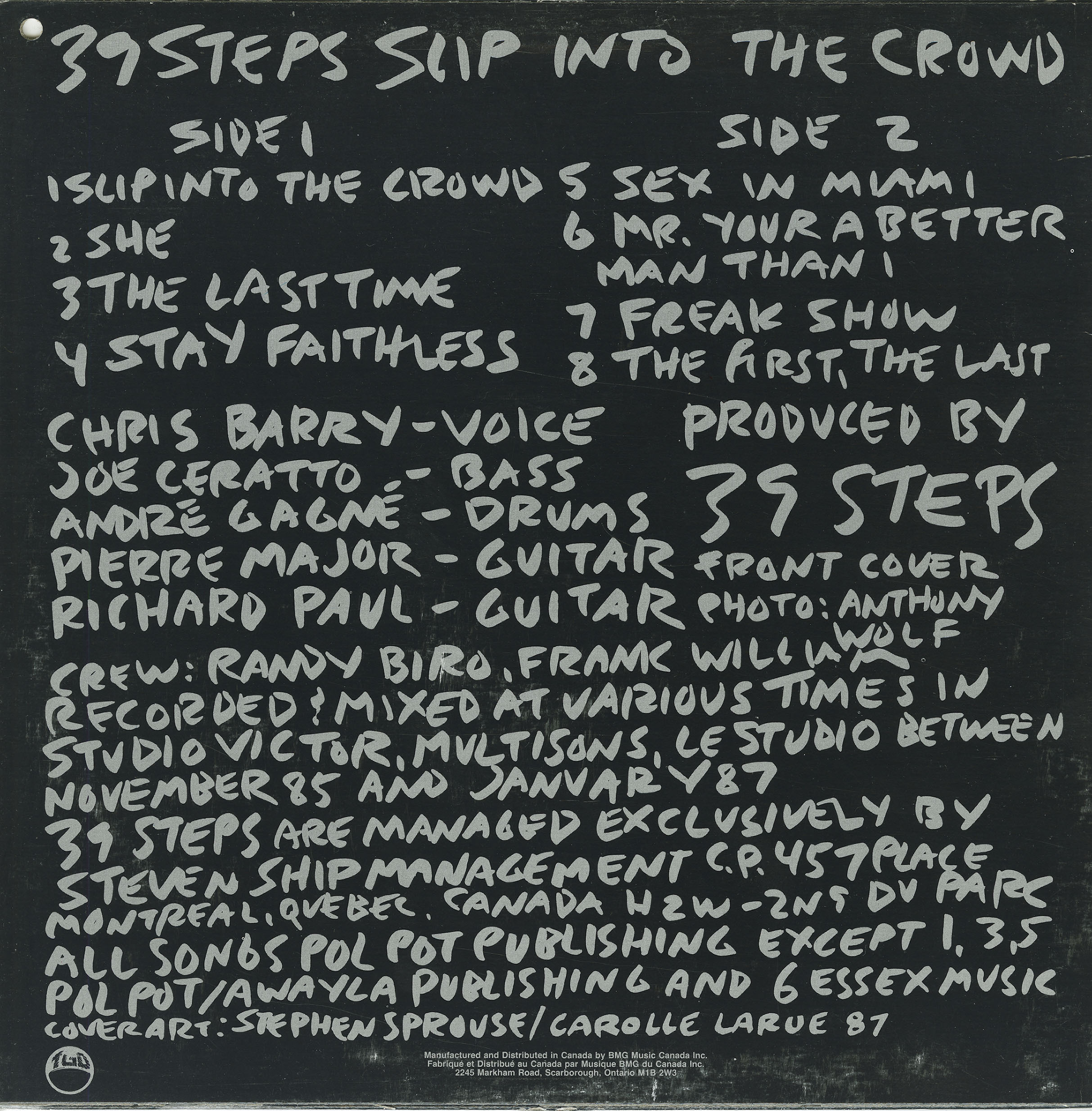39 Steps formed out of the ashes of The 222's. At age 15 and still in Junior High School, singer Chris Barry started his music career by launching the Montreal band The 222's. After the release of two singles and an recording an aborted LP for a Montreal drug lord (who wanted the band to release a pop record), The 222's high tailed it out of Montreal to Toronto where they weren't able to sustain themselves. Chris Barry headed to England where he would team up with ex-Sex Pistols bassist Glen Matlock but the two didn't see eye to eye and instead, with Barry living in squalor in vacant flats and the English tubeway system he joined the Southern Death Cult following Ian Astbury's departure. The band was ill equipped and folded once Astbury decided to take part of their name and form The Cult. With Barry now unemployed and broke, he returned to North America and reformed the 222's in Montreal with former members Pierre Major and Joe Cerratto. With the addition of Gagne and Paul they became 39 Steps (after the movie of the same name). In 1984, six months after their formation, they recorded and released a self-titled EP on Line Records. With a move to New York City instigated by ex-Montreal patriot and manager Steven Shipp (Bootsauce, Cycle Sluts From Hell), and in 1985 they answered a cattle call for a band to appear in Woody Allen's 'Hannah And Her Sisters'. They sent a tape and photo, auditioned for Allen and performed their song "Slip Into The Crowd" at CBGB's in the film. After touring the EP and gaining MTV exposure, a full length album called 'Slip Into The Crowd' followed in 1987 on RCA Records out of New York. They were soon dropped by RCA and then signed to Chrysalis in 1989, but Chrysalis wanted another Slaughter to add to their roster and 39 Steps took exception to the insult. Despite recording with Blondie's Chris Stein, no album released and a protracted 2 year battle ensued. 39 Steps decided to wait out the length of the contract. In 1991, Joan Jett saw the band and became a fan. The group still had control over the Chris Stein material and headed back into the studio with Jett's producer John Alosa and engineer Glen Robinson (13 Engines, GWAR, VoiVod) to produce their long awaited follow up 'Neon Bible' in 1993. "(All Roads Lead To) Babylon" was released as the single/video which received moderate rotation on MTV, but it seemed that 39 Steps aggro-rock had passed its prime with the onslaught of the grunge movement. Chris Barry is currently with a new act called Acrylic.