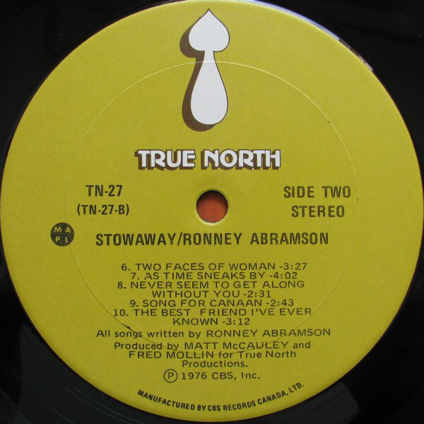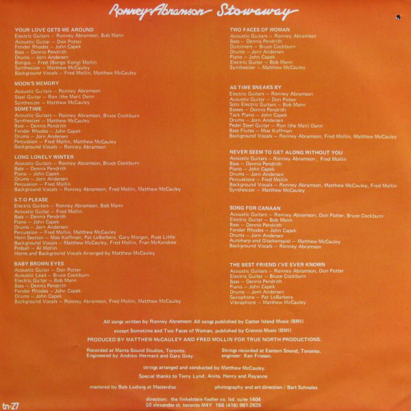 Two more singles from the album, “Never Seem To Get Along Without You” and “Light Up Your Love”, climbed into the Top 100 on the Canadian RPM singles chart, with the latter tune climbing highest to #81 nationally. Other recording artists on the True North label, Moe Koffman and Bruce Cockburn, both contributed as musicians on a couple of tracks on Stowaway. In 1978 Abramson contributed backing vocals on “Prenons La Mer“, a track on Cockburn’s album Further Adventures Of. She would appear as a background singer on several on Bruce Cockburn’s albums into the 1980s.