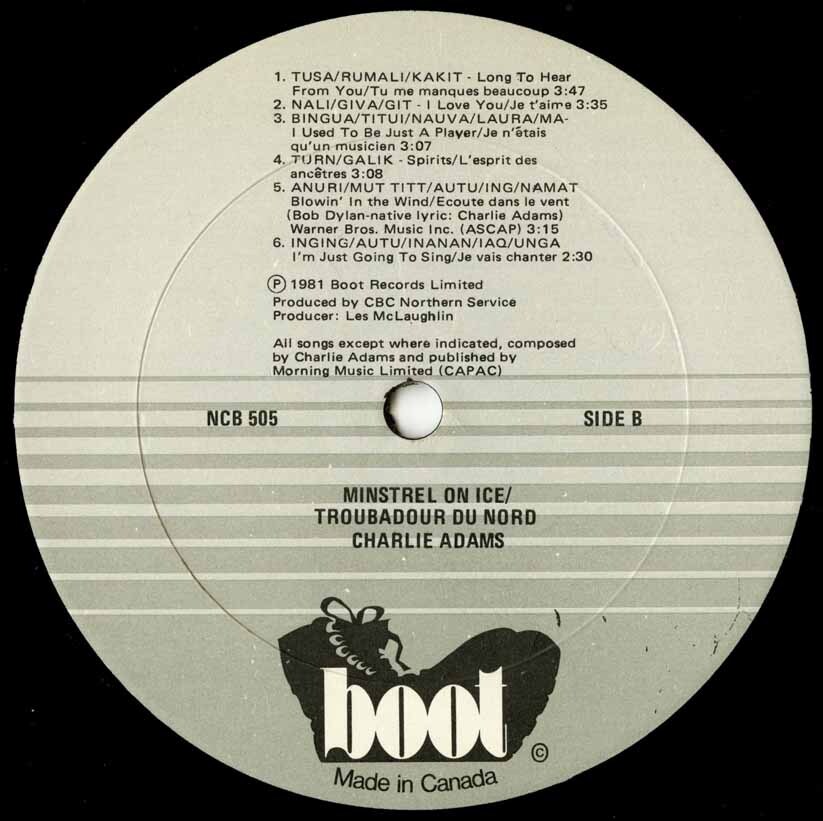 At a time when many Inuit musicians were organizing into groups and staging performances in the villages and hamlets across the Keewatin and Ungava districts, Charlie Adams struck out on his own. He preferred to work alone – not out of pride or ego – just to better reflect the way he saw the world.