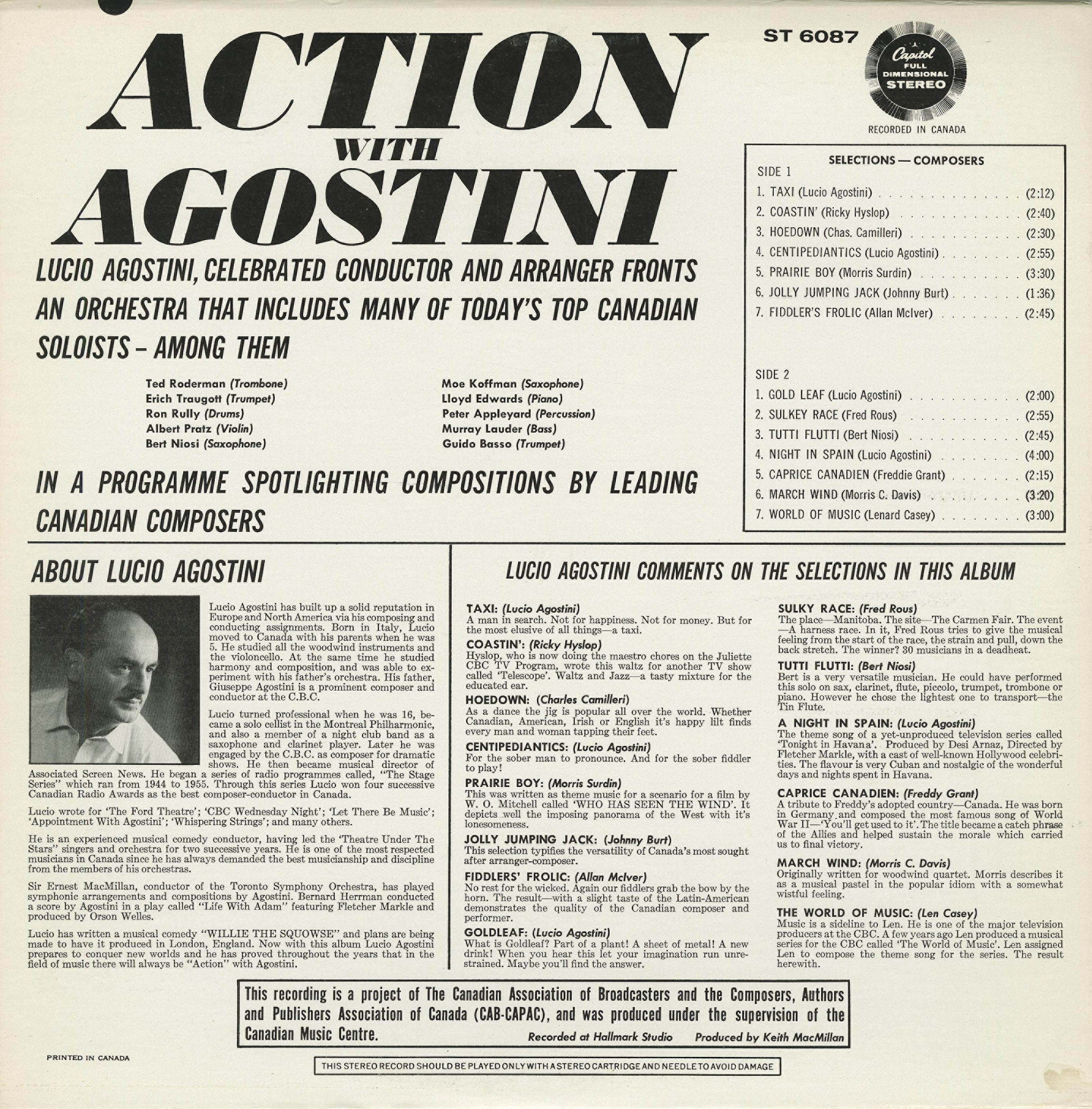 This recording is a project of The Canadian Association of Broadcasters and the Composers, Authors and Publishers Association of Canada (CAB–CAPAC), and was produced under the supervision of the Canadian Music Centre.