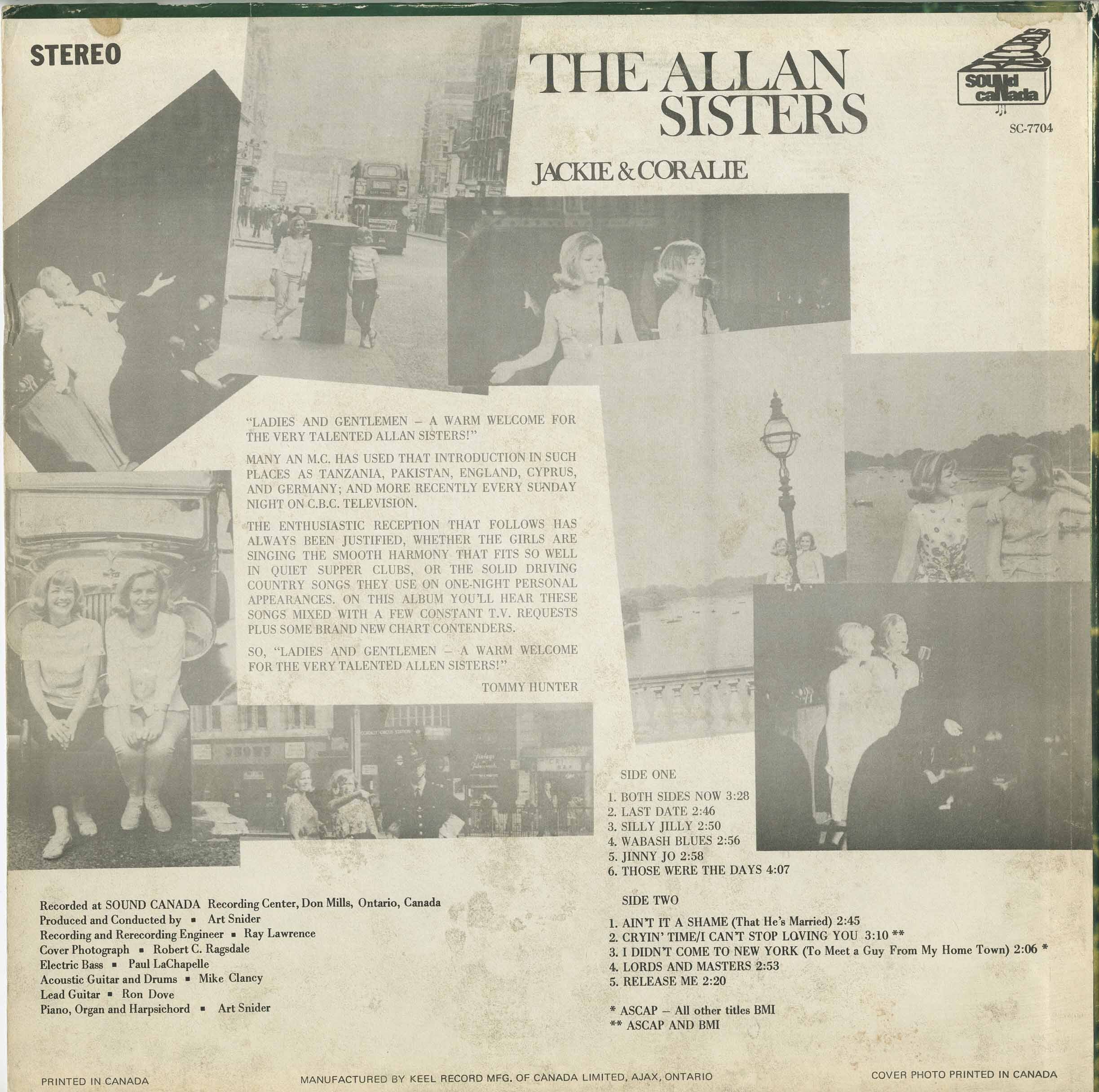 That same year they appeared on CTV’s A Go-Go ’66, which led to an invitation from Tommy Hunter. For more than a decade, the Allan Sisters were regular performers on The Tommy Hunter Show, appearing on CBC television throughout the late 1960s and 1970s. This exposure shifted their sound closer to country, a move that suited their voices and stage presence. In 1969 they recorded their debut LP, Jackie & Coralie, backed by Toronto psych-rockers Rockadrome. The album, issued on Snider’s Sound Canada label, mixed pop and country influences and is now a rare collector’s item.