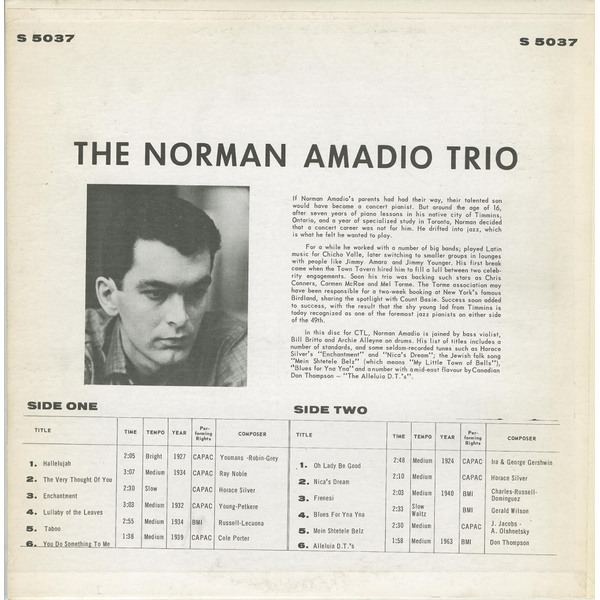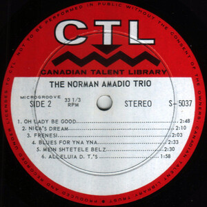 Amadio also led trios (usually, Bob Price, bass, and Alex Lazaroff, drums) at several Toronto lounges and was the orchestra leader 1987-8 at the Imperial Room of the Royal York Hotel. Concurrent to his club work, he was a member of many studio orchestras, music director for CBC TV's 'Music Hop' 1963-7 and for several CBC pop and country-music specials, and the pianist and an occasional soloist 1977-81 on the syndicated TV series 'Nashville Swing'. His discography includes The Norman Amadio Trio (1963, CTL CTLS-037), with Alleyne and the bassist Bill Britto, and other records as accompanist to Tommy Ambrose, Moe Koffman, and Phyllis Marshall.
