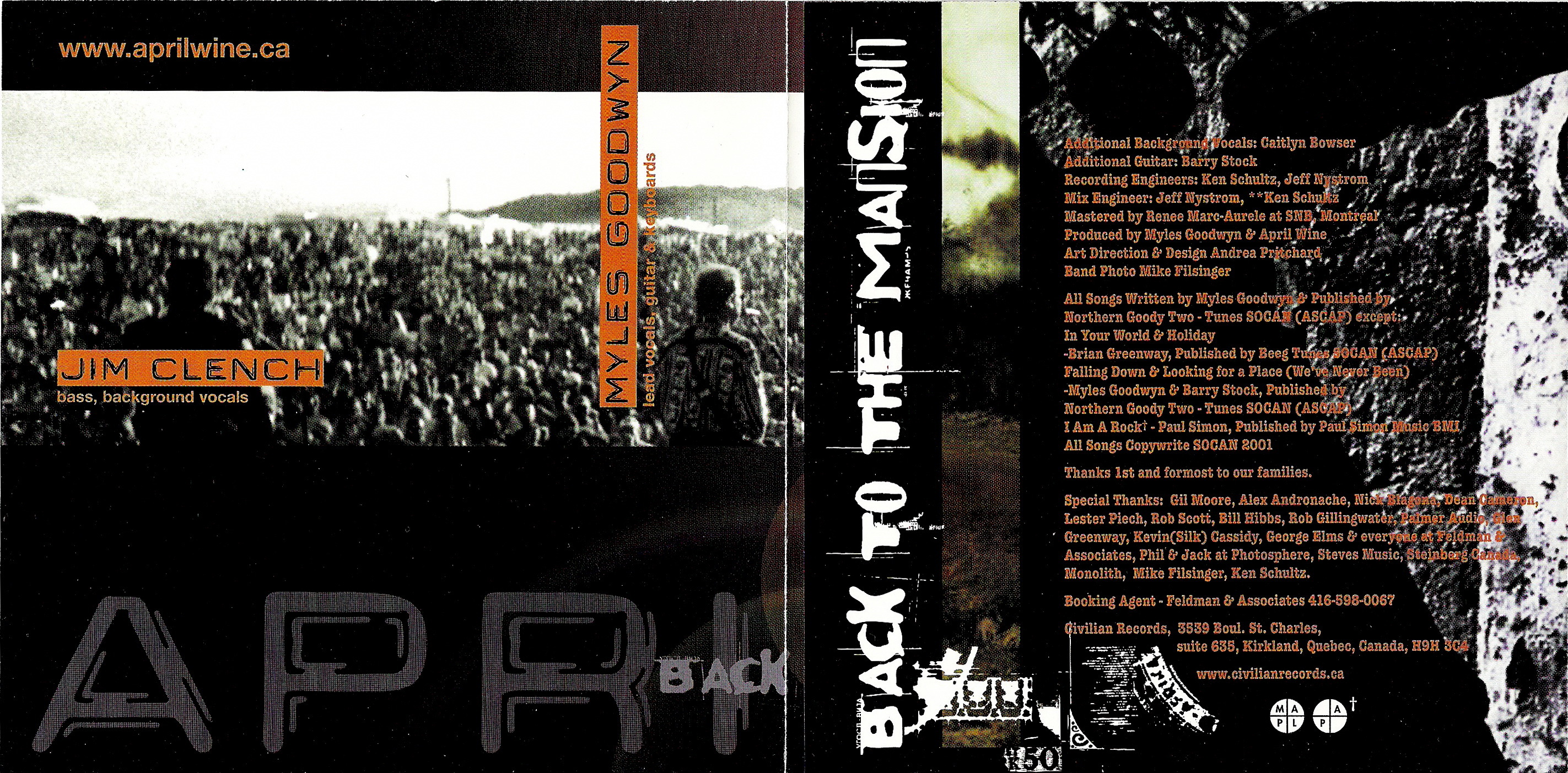 Back To The Mansion is April Wine's 18th album in their 31-year career as a band and features original members Myles Goodwyn (vocals, guitars and keyboards), Brian Greenway (guitars, vocals), Jim Clench (bass, background vocals), Jerry Mercer (drums).